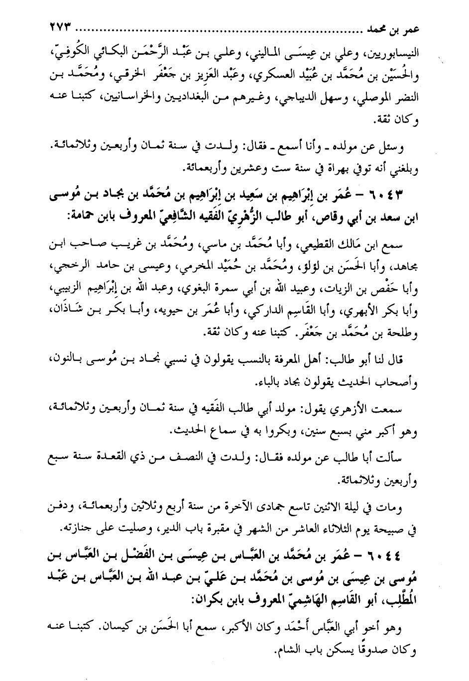 6044- عُمَر بْن مُحَمَّد بْن الْعَبَّاس بْن عِيسَى بْن الفضل بْن الْعَبَّاس بْن مُوسَى بْن عِيسَى بْن مُوسَى بْن مُحَمَّد بْن عَلِيّ بْن عَبْد اللَّه بن العباس بْن عَبْد المطلب، أَبُو القاسم الهاشمي المعروف بابن بكران: