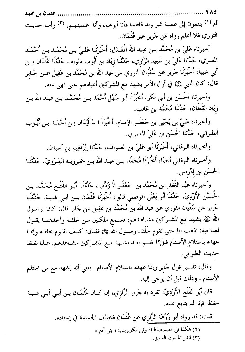 وأَخْبَرَنَاهُ عَبْدُ الْغَفَّارِ بْنُ مُحَمَّدِ بْنِ جَعْفَرٍ الْمُؤَدِّبُ، حَدَّثَنَا أَبُو الْفَتْحِ مُحَمَّدُ بْنُ الْحُسَيْنِ الأَزْدِيُّ، حَدَّثَنَا أَبُو يَعْلَى الْمَوْصِلِيُّ قَالُوا: أَخْبَرَنَا عُثْمَانُ بن أبي شيبة، حَدَّثَنَا جَرِيرٌ عَنْ سُفْيَانَ الثَّوْرِيِّ عَنْ عَبْد اللَّهِ بْن مُحَمَّد بْن عَقِيلٍ عَنْ جَابِرٍ قَالَ: كَانَ رَسُولُ اللَّهِ صَلَّى اللَّهُ عَلَيْهِ وَسَلَّمَ يَشْهَدُ مَعَ الْمُشْرِكِينَ مَشَاهِدَهُمْ، فَسَمِعَ مَلَكَيْنِ مِنْ خَلْفِهِ وَأَحَدُهُمَا يَقُولُ لِصَاحِبِهِ: اذْهَبْ بِنَا حَتَّى نَقُومَ خَلْفَ رَسُولِ اللَّهِ صَلَّى اللَّهُ عَلَيْهِ وَسَلَّمَ فَقَالَ: كَيْفَ نَقُومُ خَلْفَهُ وَإِنَّمَا عَهْدُهُ بِاسْتِلامِ الأَصْنَامِ قَبْلُ؟! فَلَمْ يَعُدْ يَشْهَدُ مَعَ الْمُشْرِكِينَ مَشَاهِدَهُمْ. هَذَا لَفْظُ حَدِيثِ الطَّبَرَانِيُّ.