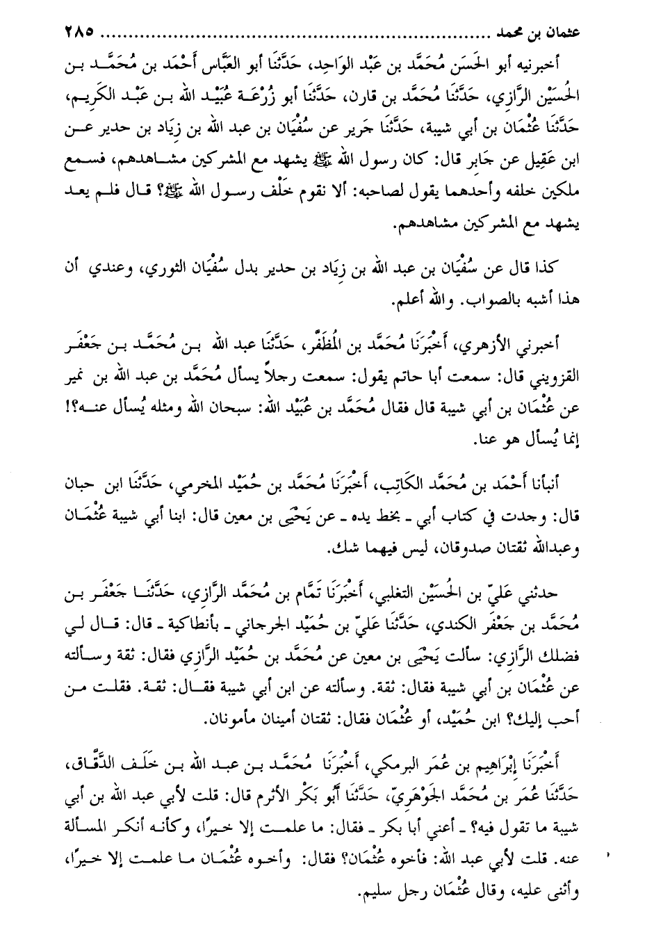 أخبرني الأزهري، أخبرنا محمّد بن المظفّر، حَدَّثَنَا عَبْد اللَّه بْن مُحَمَّد بْن جعفر القزويني قَالَ: سمعت أبا حاتم يَقُولُ: سمعت رجلا يسأل مُحَمَّدِ بْنِ عَبْدِ اللَّهِ بْنِ نُمَيْرٍ عَنْ عُثْمَان بْن أَبِي شيبة قَالَ فقال محمّد بن عبيد اللَّه: سبحان اللَّه ومثله يسأل عنه؟! إنما يسأل هو عنا.
