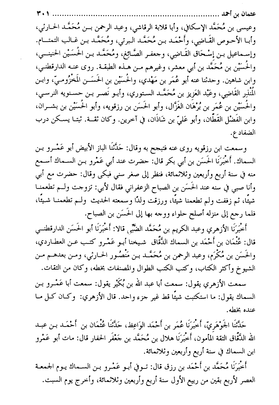 أَخْبَرَنَا الأزهري وعبد الكريم بْن مُحَمَّد الضبي قالا: أَخْبَرَنَا أَبُو الحسن الدارقطني قال: عثمان بن أحمد بن السماك الدقاق شيخنا أَبُو عَمْرو كتب عَن العطاردي، وَالحسن بْن مكرم، وعَبْد الرَّحْمَن بْن مُحَمَّد بْن منصور الحارثي، ومن بعدهم من الشيوخ وأكثر الكتاب، وكتب الكتب الطوال والمصنفات بخطه، وكان من الثقات.