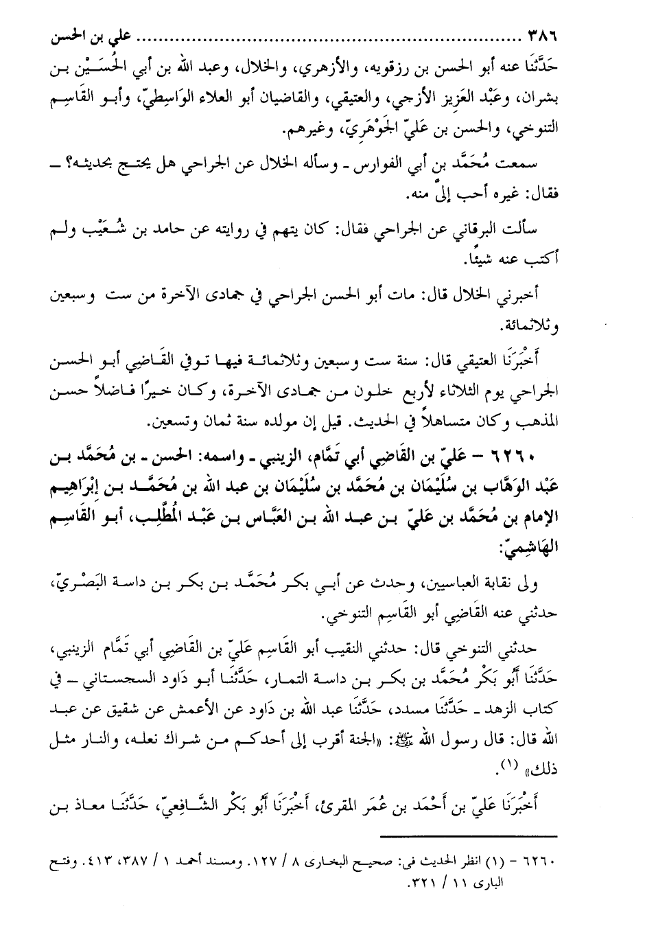 حَدَّثَنِي التَّنُوخِيُّ قَالَ: حَدَّثَنِي النَّقِيبُ أَبُو الْقَاسِمِ عَلِيُّ بْنُ الْقَاضِي أَبِي تمّام الزينبي، حَدَّثَنَا أَبُو بَكْرٍ مُحَمَّدُ بْنُ بَكْرِ بْنِ داسة التمار، حَدَّثَنَا أَبُو دَاوُدَ السِّجِسْتَانِيُّ- فِي كِتَابِ الزُّهْدِ- حدّثنا مسدد، حَدَّثَنَا عَبْدُ اللَّهِ بْنُ دَاوُدَ عَنِ الأَعْمَشِ عَنْ شَقِيقٍ عَنْ عَبْدِ اللَّهِ قَالَ: قَالَ رَسُولُ اللَّهِ صَلَّى اللَّهُ عَلَيْهِ وَسَلَّمَ: «الْجَنَّةُ أَقْرَبُ إِلَى أَحَدِكُمْ مِنْ شِرَاكِ نَعْلِهِ، وَالنَّارُ مِثْلُ ذَلِكَ» [1] .