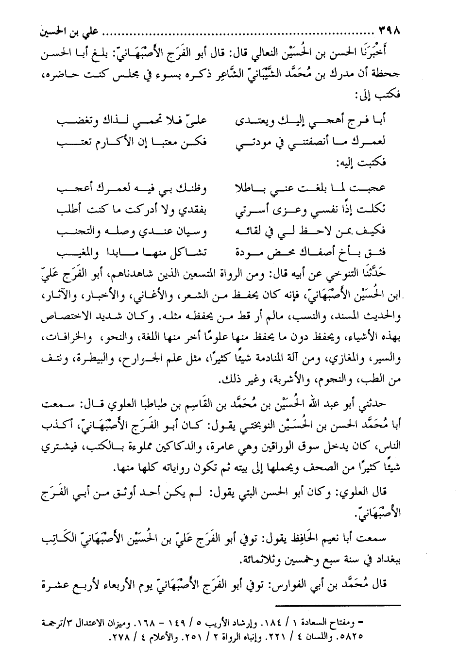 سمعت أبا نعيم الحافظ يَقُولُ: توفي أَبُو الفرج علي بْن الحسين الأصبهاني الكاتب بِبَغْدَادَ فِي سنة سبع وخمسين وثلاثمائة.
