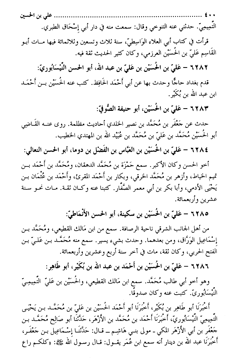 6282- علي بْن الْحُسَيْن بْن عَلِيّ بْن عَبْدِ اللَّهِ، أَبُو الحسن النِّيسَابُورِيّ: