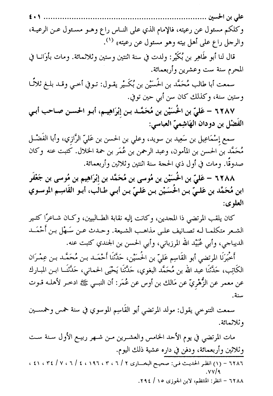 6288- علي بْن الحسين بْن مُوسَى بْن مُحَمَّد بن إبراهيم بن موسى بن جعفر ابن مُحَمَّد بْن عَلِيّ بْن الْحُسَيْن بْن عَلِيّ بْن أَبِي طالب، أَبُو الْقَاسِمِ الموسوي العلوي [2] :