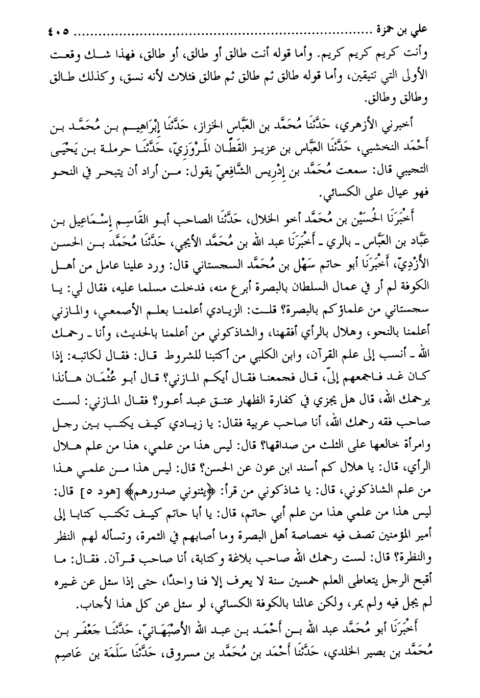 أَخْبَرَنَا الحسين بْن مُحَمَّد أخو الخلال، حَدَّثَنَا الصاحب أَبُو القاسم إِسْمَاعِيل بْن عباد بن العباس- بالري- أخبرنا عبد الله بن محمّد الإيجي، حدّثنا محمّد بن الحسن الأزديّ، أَخْبَرَنَا أَبُو حاتم سهل بْن مُحَمَّد السجستاني قَالَ: ورد علينا عامل من أهل الكوفة لم أر فِي عمال السلطان بالبصرة أبرع منه، فدخلت مسلما عليه، فقال لي: يا سجستاني من علماؤكم بالبصرة؟ قلت: الزيادي أعلمنا بعلم الأصمعي، والمازني أعلمنا بالنحو، وهلال بالرأي أفقهنا، والشاذكوني من أعلمنا بالحديث، وأنا- رحمك اللَّه- أنسب إِلَى علم القرآن، وابن الكلبي من أكتبنا للشروط قَالَ: فقال لكاتبه: إذا كان غد فاجمعهم إليَّ، قَالَ فجمعنا فقال أيكم المازني؟ قَالَ أَبُو عُثْمَان ها أنا ذا يرحمك الله، قال هل يجزي فِي كفارة الظهار عتق عَبْد أعور؟ فقال المازني: لست صاحب فقه رحمك اللَّه، أنا صاحب عربية فقال: يا زيادي كيف يكتب بين رجل وامرأة خالعها على الثلث من صداقها؟ قَالَ: ليس هذا من علمي، هذا من علم هلال الرأي، قَالَ: يا هلال كم أسند ابْن عون عَن الحسن؟ قَالَ: ليس هذا من علمي هذا من علم الشاذكوني، قَالَ: يا شاذكوني من قرأ: يثنوني صدورهم [هود 5] قَالَ: