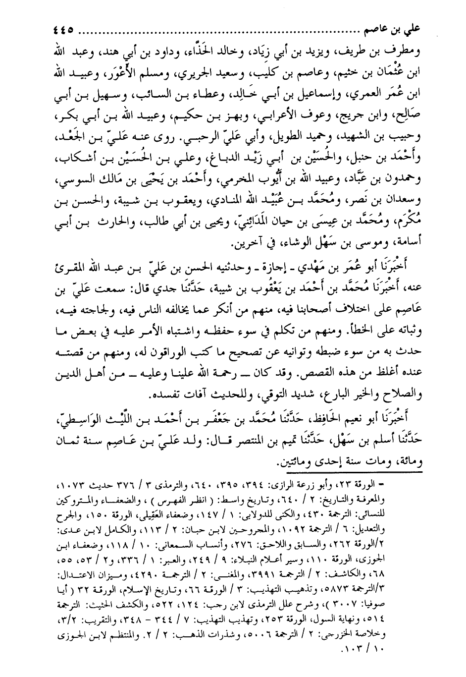 أخبرنا أبو نعيم الحافظ، حَدَّثَنَا مُحَمَّد بْن جعفر بْن أَحْمَد بْن اللّيث الواسطيّ، حدّثنا أسلم بن سهل، حَدَّثَنَا تميم بْن المنتصر قَالَ: ولد علي بْن عاصم سنة ثمان ومائة، ومات سنة إحدى ومائتين.