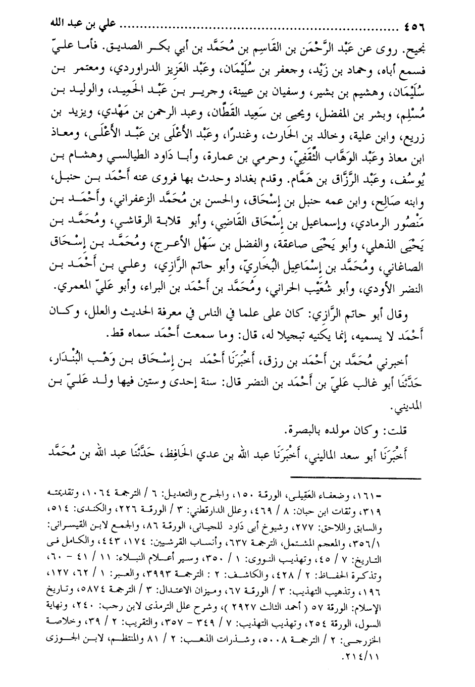 وقال أَبُو حاتم الرازي: كان علي علما فِي الناس فِي معرفة الحديث والعلل، وكان أَحْمَد لا يسميه، إنما يكنيه تبجيلا له، قَالَ: وما سمعت أَحْمَد سماه قط.