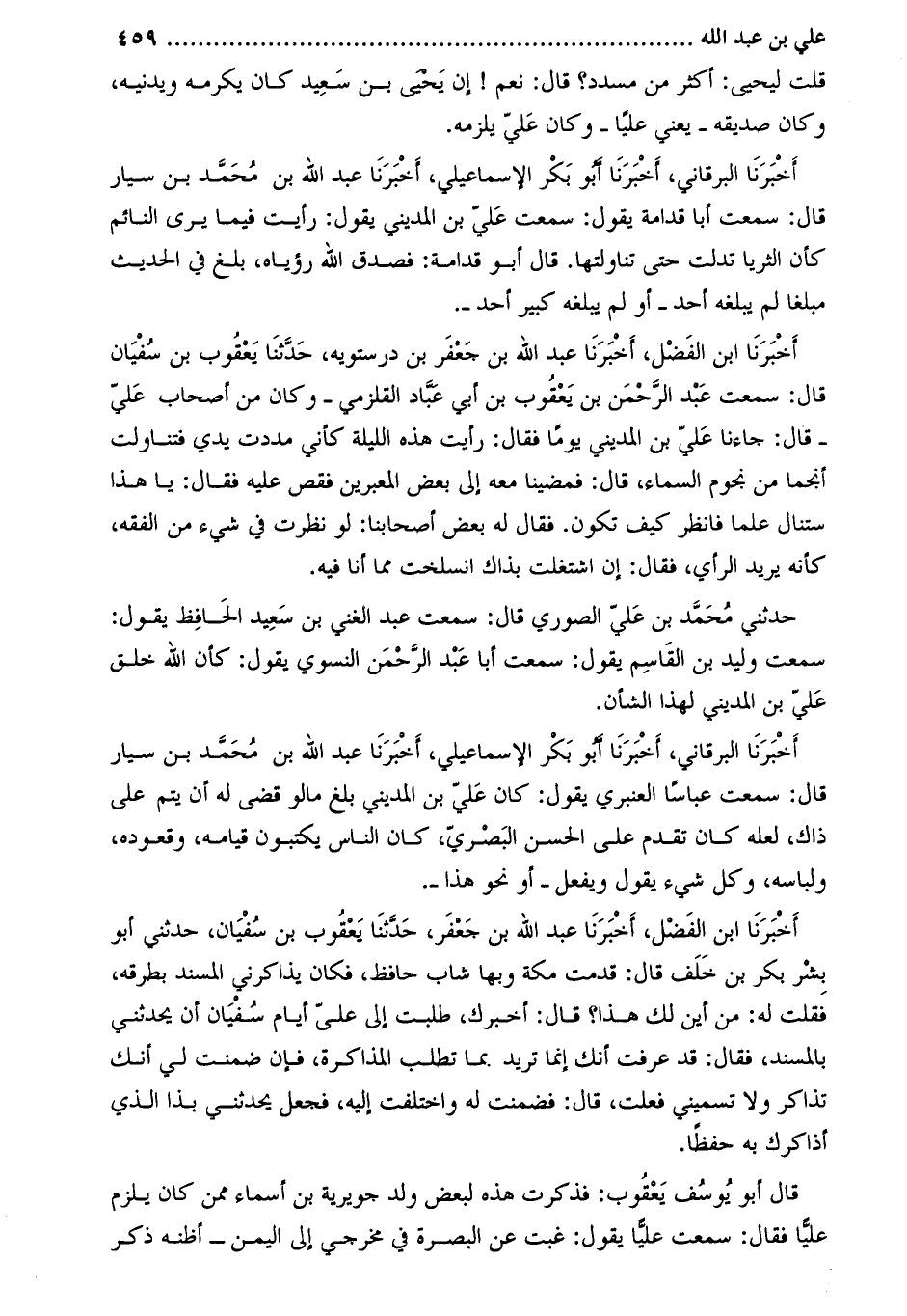 أخبرنا البرقاني، أخبرنا أبو بكر الإسماعيلي، أَخْبَرَنَا عَبْد اللَّه بْن مُحَمَّد بْن سيار قَالَ: سمعت عباسا العنبري يَقُولُ: كان عليّ بن المديني بلغ ما لو قضى له أن يتم على ذاك، لعله كان تقدم على الحسن البصري، كان الناس يكتبون قيامه، وقعوده، ولباسه، وكل شيء يَقُولُ ويفعل- أو نحو هذا-.