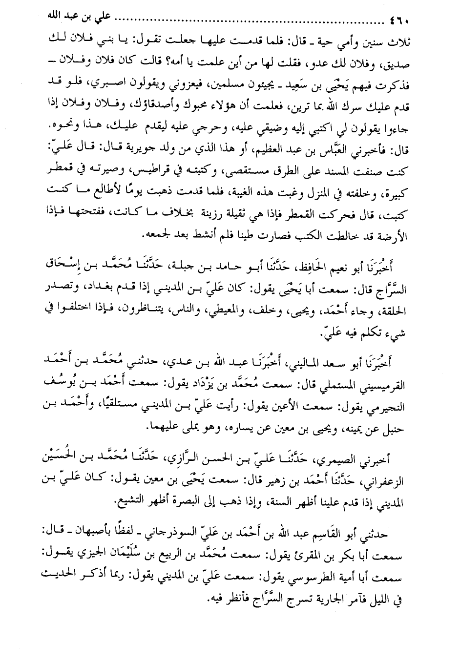 أخبرنا أبو نعيم الحافظ، حدّثنا أبو حامد بن جبلة، حَدَّثَنَا مُحَمَّد بْن إِسْحَاق السراج قَالَ: سمعت أبا يحيى يقول: كان عليّ بن المديني إذا قدم بغداد، وتصدر الحلقة، وجاء أَحْمَد، ويحيى، وخلف، والمعيطي، والناس، يتناظرون، فإذا اختلفوا فِي شيء تكلم فيه علي.