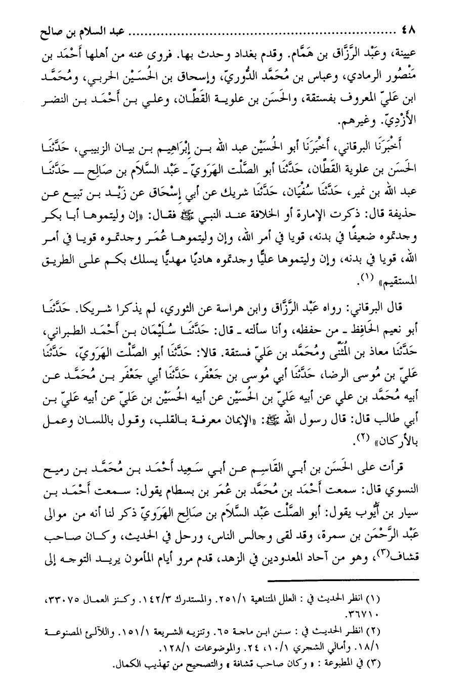 قرأت على الْحَسَن بْن أَبِي الْقَاسِم عَنْ أَبِي سَعِيد أَحْمَد بْن مُحَمَّد بْن رميح النسوي قَالَ: سَمِعْتُ أَحْمَد بْن مُحَمَّد بْن عُمَر بْن بسطام يَقُولُ: سَمِعْتُ أَحْمَد بْن سيار بن أيوب يقول: أبو الصلت عبد السلام بن صالح الهروي ذكر لنا أنه من موالي عبد الرحمن بن سمرة، وقد لقي وجالس الناس، ورحل في الحديث، وكان صاحب قشاف [3] ، وهو من آحاد المعدودين في الزهد، قدم مرو أيام المأمون يريد التوجه إلى