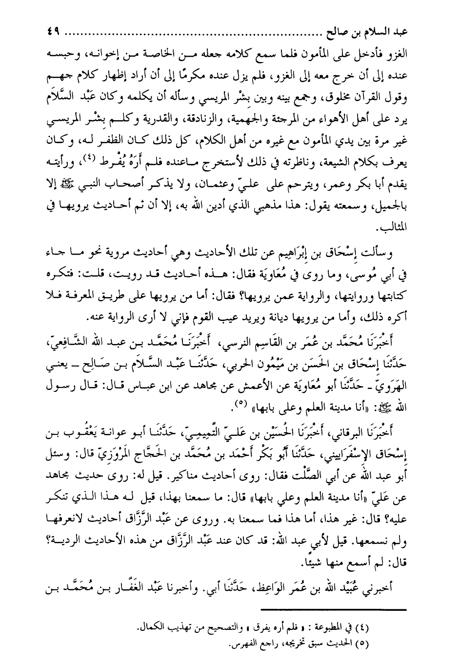 الغزو فأدخل على المأمون فلما سمع كلامه جعله من الخاصة من إخوانه، وحبسه عنده إلى أن خرج معه إلى الغزو، فلم يزل عنده مكرما إلى أن أراد إظهار كلام جهم وقول القرآن مخلوق، وجمع بينه وبين بشر المريسي وسأله أن يكلمه وكان عبد السلام يرد علي أهل الأهواء من المرجئة والجهمية، والزنادقة، والقدرية وكلم بشر المريسي غير مرة بين يدي المأمون مع غيره من أهل الكلام، كل ذلك كان الظفر له، وكان يعرف بكلام الشيعة، وناظرته في ذلك لاستخرج ما عنده فلم أره يفرط [1] ، ورأيته يقدم أبا بكر وعمر، ويترحم على علي وعثمان، ولا يذكر أصحاب النبي صَلَّى اللَّهُ عَلَيْهِ وَسَلَّمَ إلا بالجميل، وسمعته يقول: هذا مذهبي الذي أدين الله به، إلا أن ثم أحاديث يرويها في المثالب.