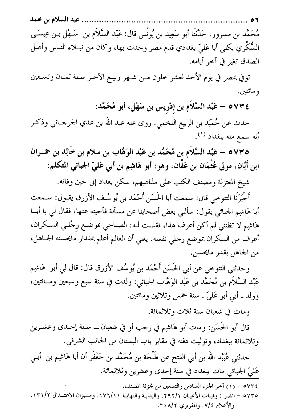 5735- عبد السلام بن محمد بن عبد الوهاب بن سلام بن خالد بن حمران ابن أبان، مولى عثمان بن عفان، وهو: أبو هاشم بن أبي علي الجبائي المتكلم [2] :