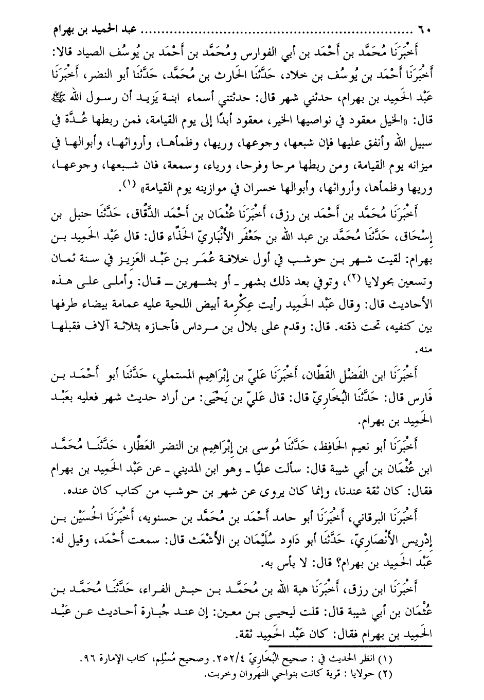 أَخْبَرَنَا أحمد بن يوسف بن خلاد، حدّثنا الحارث بن محمّد، حدّثنا أبو النضر، أخبرنا عبد الحميد بن بهرام، حَدَّثَنِي شَهْرٌ قَالَ: حَدَّثَتْنِي أَسْمَاءُ ابْنَةُ يَزِيدَ أَنَّ رَسُولَ اللَّهِ صَلَّى اللَّهُ عَلَيْهِ وَسَلَّمَ قَالَ: «الْخَيْلُ مَعْقُودٌ فِي نَوَاصِيهَا الْخَيْرُ، مَعْقُودٌ أَبَدًا إِلَى يَوْمِ الْقِيَامَةِ، فَمَنْ رَبَطَهَا عُدَّةً فِي سَبِيلِ اللَّهِ وَأَنْفَقَ عَلَيْهَا فَإِنَّ شِبَعَهَا، وَجُوعَهَا، وَرِيَّهَا، وَظَمَأَهَا، وَأَرْوَاثَهَا، وَأَبْوَالَهَا فِي مِيزَانِهِ يَوْمَ الْقِيَامَةِ، وَمَنْ رَبَطَهَا مَرَحًا وَفَرَحًا، وَرِيَاءً، وَسُمْعَةً، فَإِنَّ شَبِعَهَا، وَجُوعَهَا، وَرِيَّهَا وَظَمَأَهَا، وَأَرْوَاثَهَا، وَأَبْوَالَهَا خُسْرَانٌ فِي مَوَازِينِهِ يَوْمَ الْقِيَامَةِ» [1] .