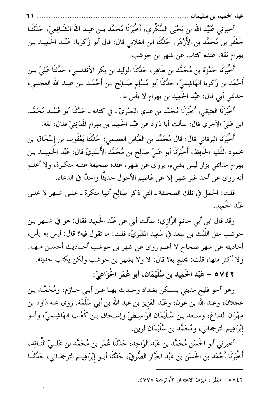 قلت: الحمل في تلك الصحيفة- التي ذكر صالح أنها منكرة- على شهر لا على عبد الحميد.