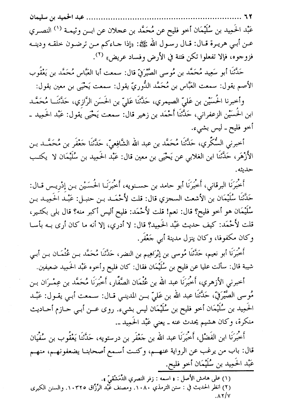 أَخْبَرَنَا ابْن الْفَضْل، أَخْبَرَنَا عَبْد اللَّه بْن جعفر بن درستويه، حَدَّثَنَا يعقوب بْن سُفْيَان قَالَ: باب من يرغب عَنِ الرواية عنهم، وكنت أسمعُ أصحابنا يضعفونهم، منهم عبد الحميد بن سليمان أخو فليح.