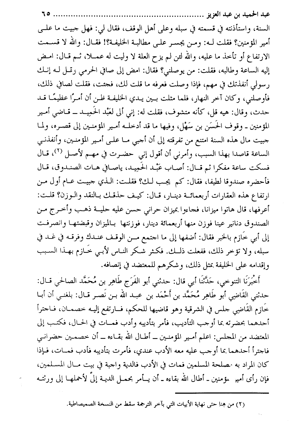 أعرفها، قال هاتوا ميزانا، فجاءوا بميزان حراني حسن عليه حلية ذهب وأخرج من الصندوق دنانير عينا فوزن منها أربعمائة دينار، فوزنتها بالميزان وقبضتها وانصرفت إلى أبي خازم بالخبر فقال: أضفها إلى ما اجتمع من الوقف عندك وفرقه في غد في سبله، ولا تؤخر ذلك، ففعلت ذلك. فكثر شكر الناس لأبي خازم بهذا السبب وإقدامه على الخليفة بمثل ذلك، وشكرهم للمعتضد في إنصافه.