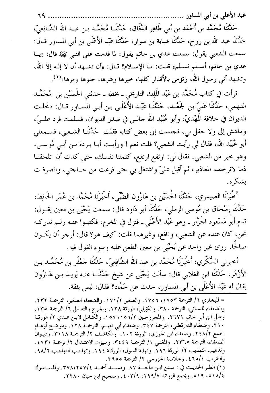 حَدَّثَنَا مُحَمَّدُ بْنُ أَحْمَدَ بْنِ أَبِي طَاهِرٍ الدقاق، حدّثنا محمّد بن عبد الله الشّافعيّ، حدّثنا عبد الله بن روح، حدّثنا شبابة بن سوار، حدثنا عبد الأعلى بن أبي المساور قال: