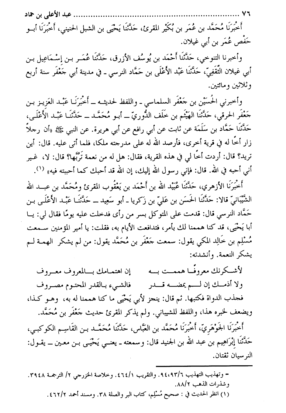 أخبرنا الأزهري، حَدَّثَنَا عُبَيْدُ اللَّهِ بْنُ أَحْمَدَ بْنِ يَعْقُوبَ المقرئ ومحمد بن عبد الله الشيباني قالا: حَدَّثَنَا الْحَسَن بن عَلِيّ بن زكريا- أَبُو سعيد- حَدَّثَنَا عَبْدُ الأَعْلَى بْنُ حَمَّادٍ النَّرْسِيُّ قَالَ: قدمت على المتوكل بسر من رأى فدخلت عليه يوما فقال لي: يا أبا يحيى، قد كنا هممنا لك بأمر، فتدافعت الأيام به، فقلت: يا أمير المؤمنين سمعت مسلم بن خالد المكي يقول: سمعت جعفر بن محمد يقول: من لم يشكر الهمة لم يشكر النعمة. وأنشدته: