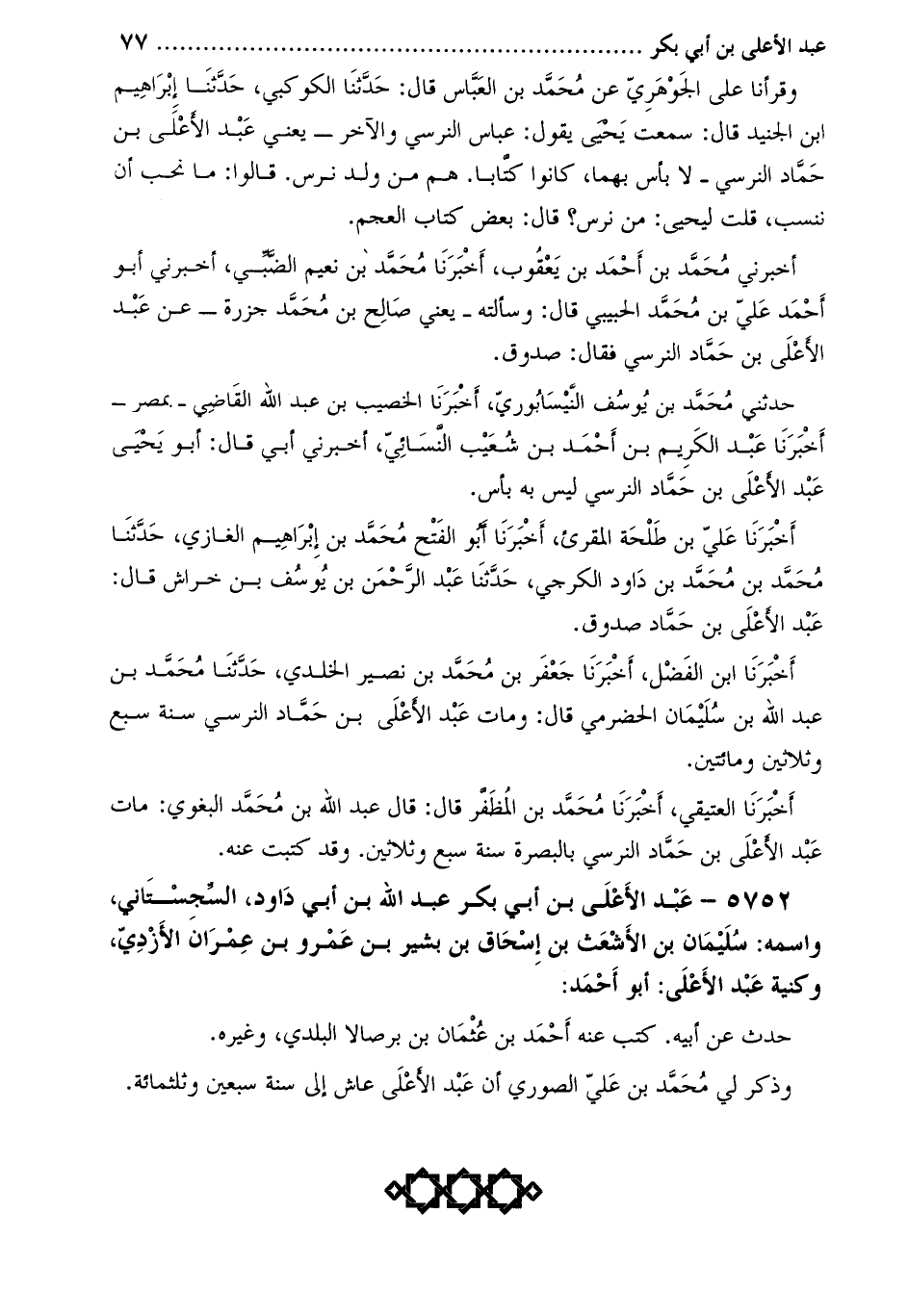 5752- عبد الأعلى بن أبي بكر عبد الله بن أبي داود، السجستاني، واسمه: سليمان بن الأشعث بن إسحاق بن بشير بن عمرو بن عمران الأزدي، وكنية عبد الأعلى: أبو أحمد: