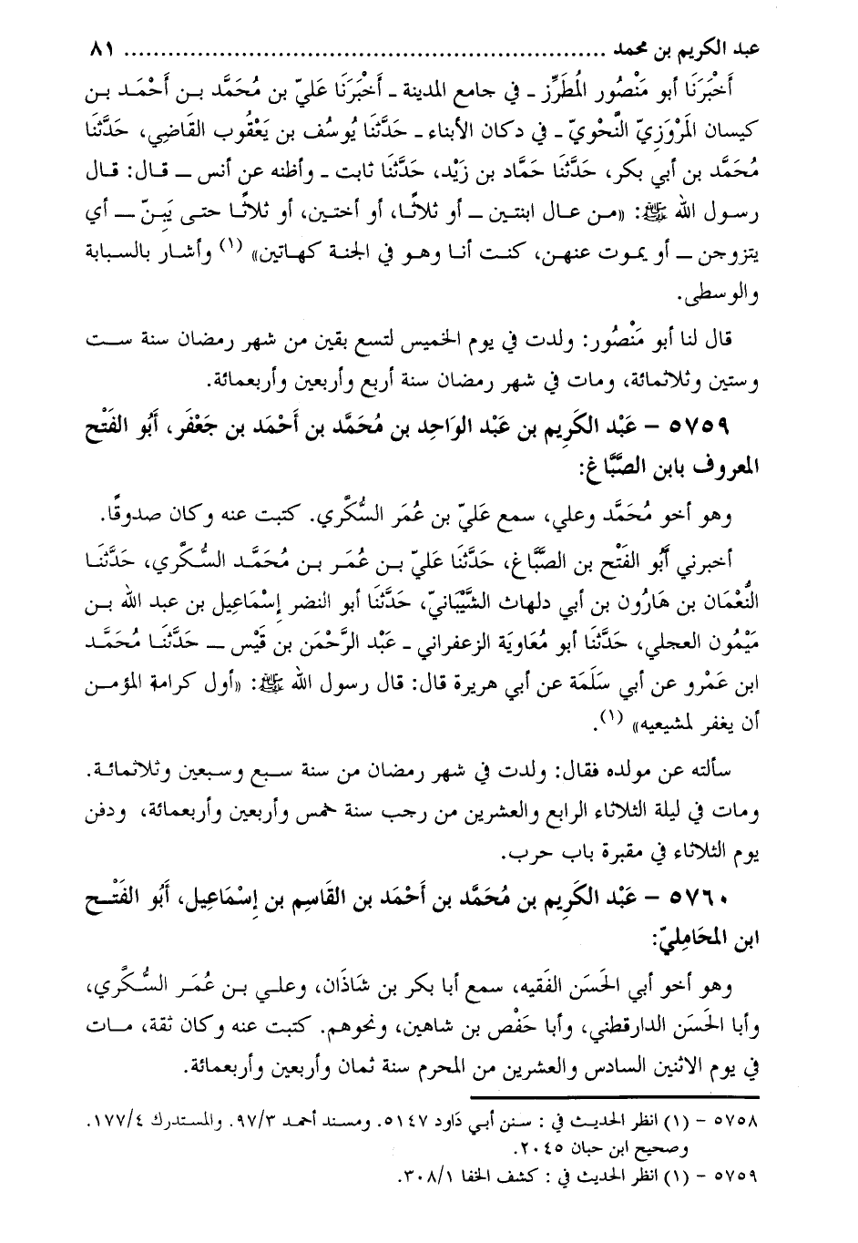 أَخْبَرَنَا أَبُو مَنْصُورٍ الْمُطَرِّزُ- فِي جَامِعِ الْمَدِينَةِ- أَخْبَرَنَا عَلِيُّ بْنُ مُحَمَّدِ بْنِ أَحْمَدَ بْنِ كيسان المروزيّ النّحويّ- في دكان الأبناء- حدّثنا يوسف بن يعقوب القاضي، حدّثنا محمّد بن أبي بكر، حدّثنا حمّاد بن زيد، حَدَّثَنَا ثَابِتٌ- وَأَظُنُّهُ عَنْ أَنَسٍ- قَالَ: قَالَ رَسُولُ اللَّهِ صَلَّى الله عليه وسلم: «مَنْ عَالَ ابْنَتَيْنِ- أَوْ ثَلاثًا، أَوْ أُخْتَيْنِ، أَوْ ثلاثا حتى يبنّ- أي يتزوجن- أَوْ يَمُوتَ عَنْهُنَّ، كُنْتُ أَنَا وَهُوَ فِي الْجَنَّةِ كَهَاتَيْنِ» [1]