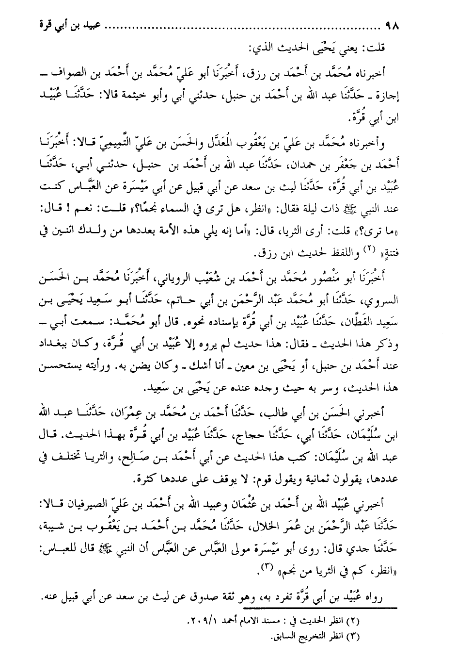 أَخْبَرَنِي الْحَسَن بْن أَبِي طالب، حَدَّثَنَا أَحْمَد بْن محمّد بن عمران، حدّثنا عبد الله ابن سليمان، حدّثنا أبي، حدّثنا حجاج، حَدَّثَنَا عبيد بن أبي قرة بهذا الحديث. قال عبد الله بن سليمان: كتب هذا الحديث عن أبي أحمد بن صالح، والثريا تختلف في عددها، يقولون ثمانية ويقول قوم: لا يوقف على عددها كثرة.
