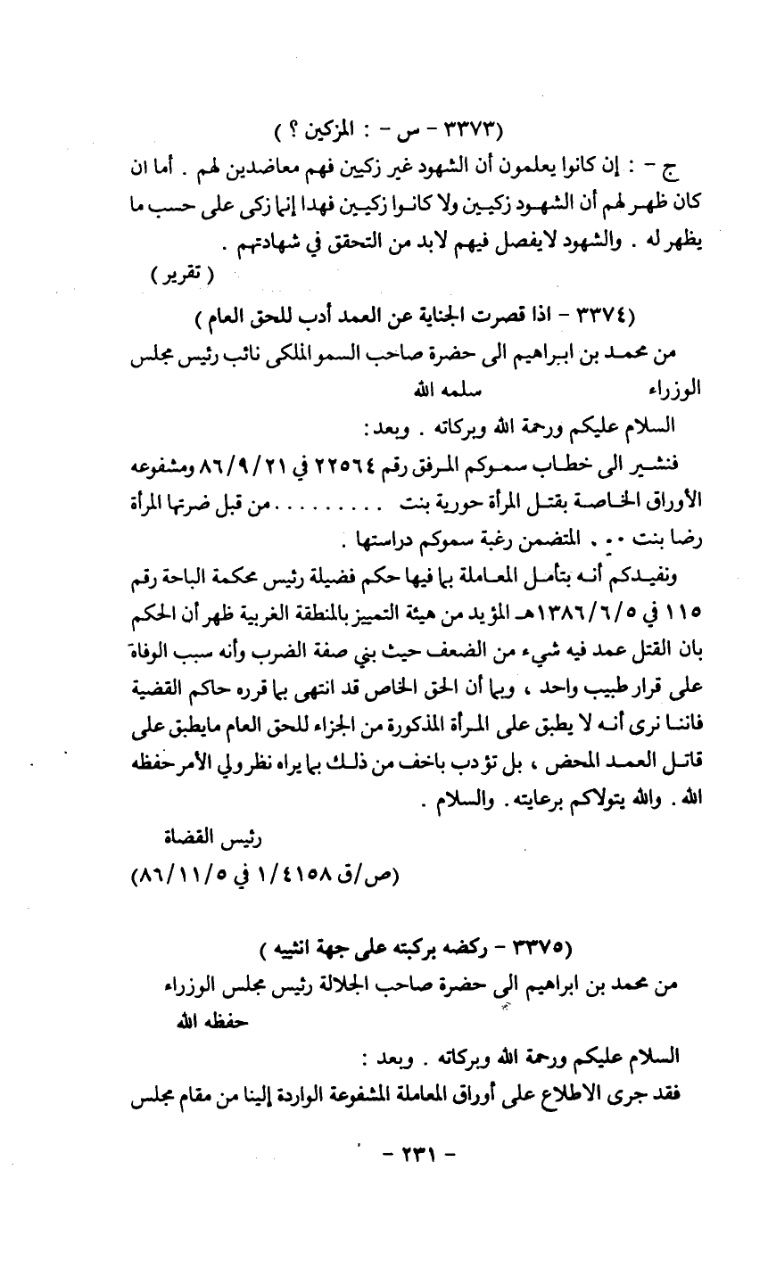 ونفيدكم أنه بتأمل المعاملة بما فيها حكم فضيلة رئيس محكمة الباحة رقم 115 في 5/6/1386 المؤيد من هيئة التمييز بالمنطقة الغربية ظهر أ، الحكم بأن القتل عمد فيه شيء من الضعف حيث بنى صفة الضرب وأنه سبب الوفاة على قرار طبيب واحد، وبما أن الحق الخاص قد انتهى بما قرره حاكم القضية فإننا نرى أنه لا يطبق على المرأة المذكورة من الجزاء للحق العام ما يطبق على قاتل العمد المحض، بل تؤدب بأخف من ذلك بما يراه نظر ولي الأمر حفظه الله. والله يتولاكم برعايته. والسلام.