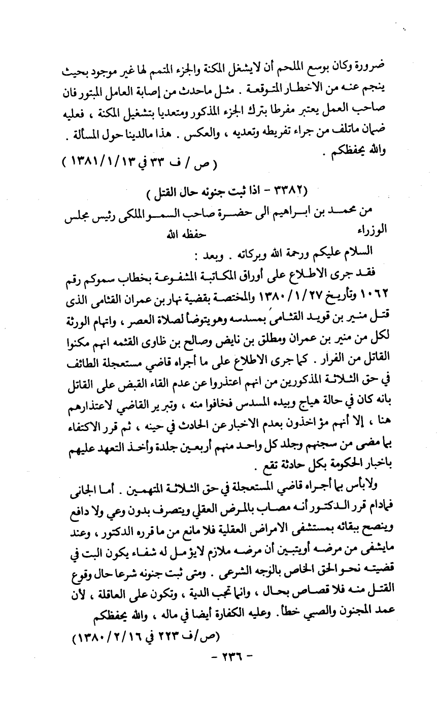 فقد جرى الاطلاع على أوراق المكاتبة المشفوعة بخطاب سموكم رقم 1062 وتاريخ 27/1/1380 والمختصة بقضية نهار بن عمران القثامي الذي قتل منير بن قويد القثامي بمسدسه وهو يتوضأ لصلاة العصر، واتهام الورثة لكل من منير بن عمران ومطلق بن نابض وصالح بن ظاوي القثمه أنهم مكنوا القاتل من الفرار، كما جرى الاطلاع على ما أجراه قاضي مستعجلة الطائف في حق الثلاثة المذكورين من أنهم اعتذروا عن عدم إلقاء القبض على القاتل بأنه كان في حالة هياج وبيده المسدس فخافوا منه، وتبرير القاضي لاعتذارهم هنا، إلا أنهم مؤاخذون بعدم الإخبار عن الحادث في حينه، ثم قرر الاكتفاء بما مضى من سجنهم وجلد كل واحد منهم أربعين جلدة وأخذ التعهد عليهم بإخبار الحكومة بكل حادثة تقع.