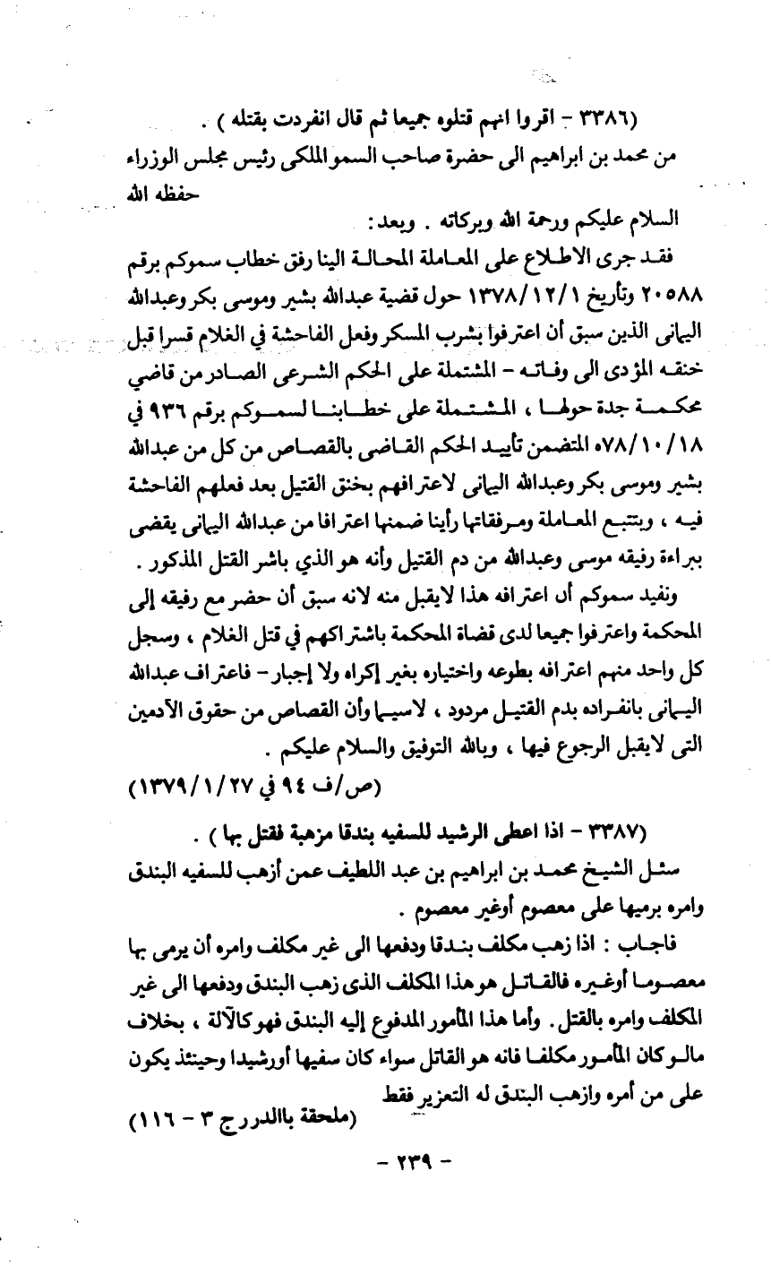 فقد جرى الاطلاع على المعاملة المحالة إلينا رفق خطاب سموكم برقم 20588 وتاريخ 1/12/1378 حول قضية عبد الله بشير وموسى بكر وعبد الله اليماني الذين سبق أن اعترفوا بشرب المسكر وفعل الفاحشة في الغلام قسراً قبل خنقه المؤدي إلى وفاته -المشتملة على الحكم الشرعي الصادر من قاضي محكمة جدة حولها، المشتملة على خطابنا لسموكم برقم 936 في 18/10/1378 المتضمن تأييد الحكم القاضي بالقصاص من كل من عبد الله بشير وموسى بكر وعبد الله اليماني لاعترافهم بخنق القتيل بعد فعلهم الفاحشة فيه، وبتتبع المعاملة ومرفقاتها رأينا ضمنها اعترافاً من عبد الله اليماني يقضي ببراءة رفيقه موسى وعبد الله من دم القتيل وأنه هو الذي باشر القتل المذكور.