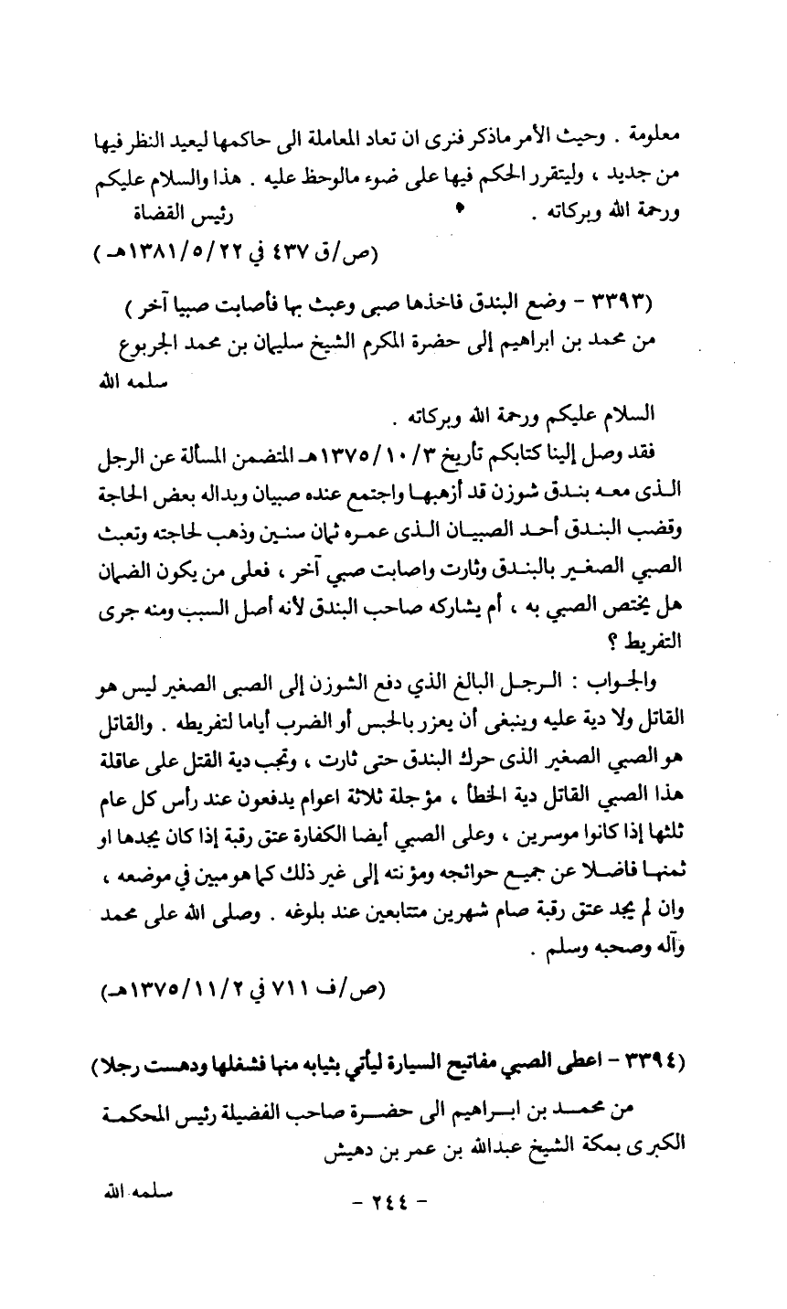 فقد وصل إلينا كتابكم تاريخ 3/10/1375 المتضمن المسألة عن الرجل الذي معه بندق شوزن قد أزهبها واجتمع عنده صبيان وبداله بعض الحاجة وقضب البندق أحد الصبيان الذي عمره ثمان سنين وذهب لحاجته وتعبث الصبي الصغير بالبندق وثارت وأصابت صبي آخر، فعلى من يكون الضمان هل يختص الصبي به، أم يشاركه صاحب البندق لأنه أصل السبب ومنه جرى التفريط؟