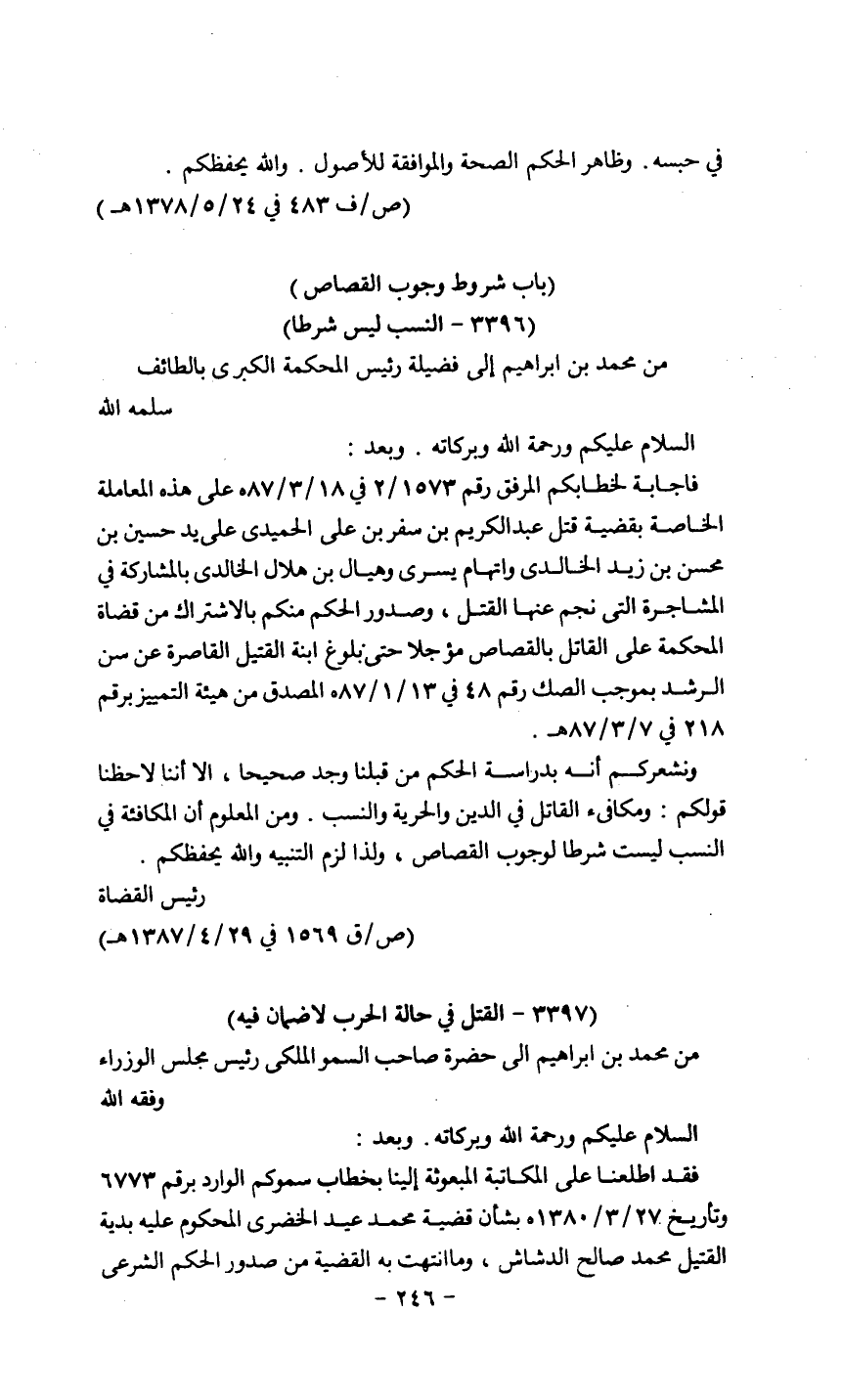 فإجابة لخطابكم المرفق رقم 1573/2 في 18/3/1387 على هذه المعاملة الخاصة بقضية قتل عبد الكريم بن سفر بن علي الحميدي على يد حسين بن محسن بن زيد الخالدي واتهام يسري وهيال بن هلال الخالدي بالمشاركة في المشاجرة التي نجم عنها القتل، وصدور الحكم منكم بالاشتراك في قضاة المحكمة على القاتل بالقصاص مؤجلاً حتى بلوغ ابنة القتيل القاصرة عن سن الرشد، بموجب الصك رقم 48 في 13/1/1387 المصدق من هيئة التمييز برقم 218 في 7/3/1387هـ.