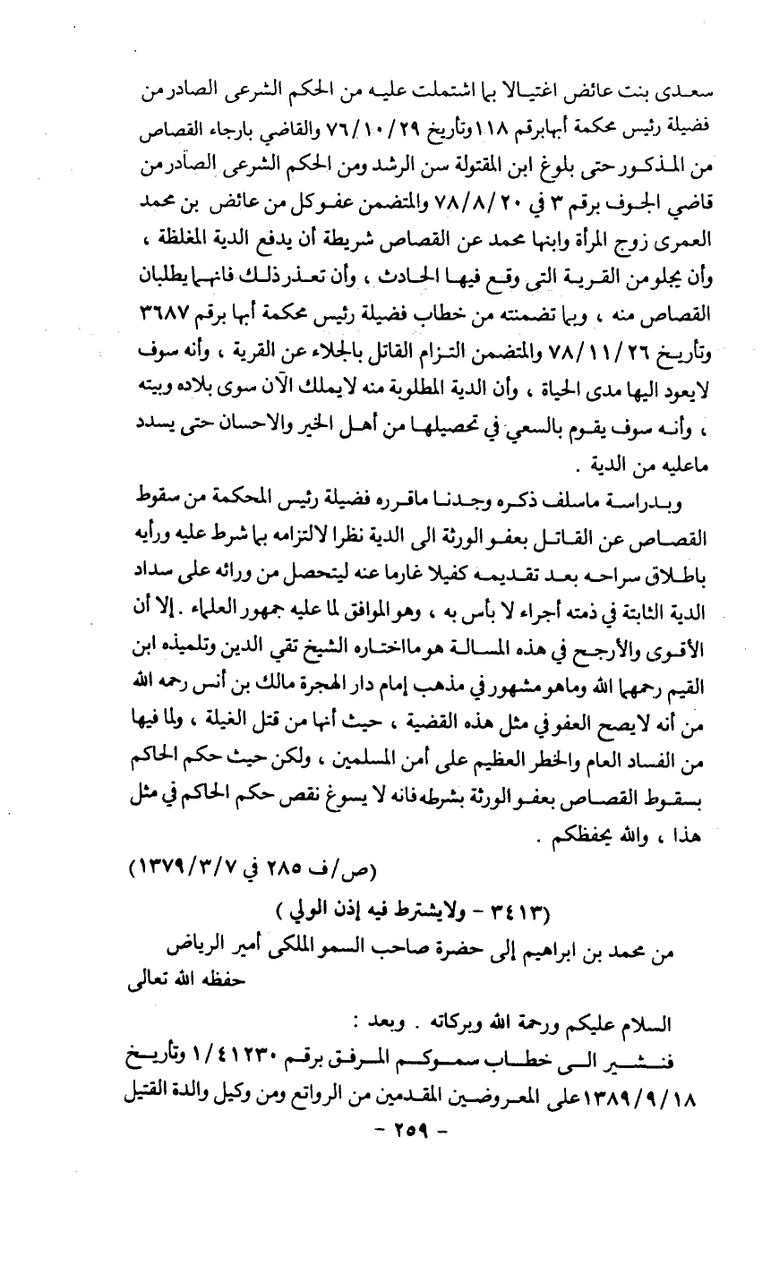 سعدي بنت عائض اغتيالاً بما اشتملت عليه من الحكم الشرعي الصادر من فضيلة رئيس محكمة أبها برقم 118 وتاريخ 29/10/76 والقاضي بإرجاء القصاص من المذكور حتى بلوغ ابن المقتولة سن الرشد ومن الحكم الشرعي الصادر من قاضي الجوف برقم 3 في 20/8/78 والمتضمن عفو كل من عائض بن محمد العمري زوج المرأة وابنها محمد عن القصاص شريطة أن يدفع الدية المغلظة، وأن يجلو من القرية التي وقع فيها الحادث، وأن تعذر ذلك فإنهما يطلبان القصاص منه، وبما تضمنته من خطاب فضيلة رئيس محكمة أبها برقم 3687 وتاريخ 26/11/78 والمتضمن التزام القاتل بالجلاء عن القرية، وأنه سوف لا يعود إليها مدى الحياة، وأن الدية المطلوبة منه لا يملك الآن سوى بلاده وبيته، وأنه سوف يقوم بالسعي في تحصيلها من أهل الخير والإحسان حتى يسدد ما عليه من الدية.
