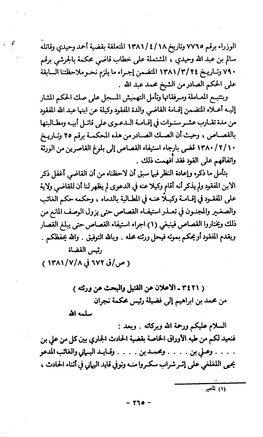 الوزراء برقم 7765 وتاريخ 18/4/1381 المتعلقة بقضية أحمد وحيدي وقاتله سالم بن عبد الله وحيدي، المشتملة على خطاب قاضي محكمة بالجرشي برقم 790 وتاريخ 14/3/1381 المتضمن إجراء ما يلزم نحو ملاحظتنا السابقة على الحكم الصادر من الشيخ محمد عبد الله.