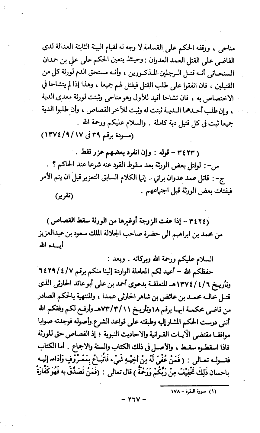 حفظكم الله - أعيد لكم المعاملة الواردة إلينا منكم برقم 7/4/6429 وتاريخ 6/4/1374هـ المتعلقة بدعوى أحمد بن علي أبو عائد الحارثي الذي قتل خاله محمد بن عائض بن شاهر الحارثي عمداً، والمنهية بالحكم الصادر من قاضي محكمة أبها برقم 18/ وتاريخ 11/3/73هـ وأرفع لكم وفقكم الله أنني درست الحكم المشار إليه وطبقته على قواعد الشرع وأصوله فوجدته صواباً موافقاً مقتضى الآيات القرآنية والأحاديث النبوية، إذ القصاص حق للورثة فإذا أسقطوه سقط، والأصل في ذلك الكتاب والسنة والإجماع، أما الكتاب فقوله تعالى: {فمن عُفي له من أخيه شيء فاتباع بمعروف وأداء إليه بإحسان، ذلك تخفيف من ربكم ورحمة} . قال تعالى {فمت تصدق به فهو كفارة
