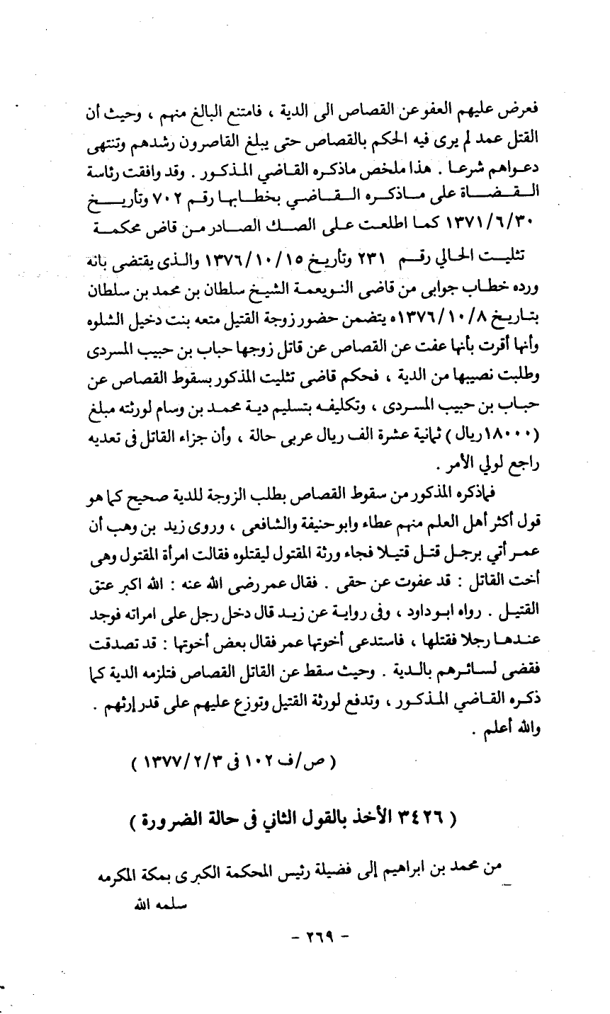 فعرض عليهم العفو عن القصاص إلى الدية، فامتنع البالغ منهم، وحيث أن القتل عمد لم يرى فيه الحكم بالقصاص حتى يبلغ القاصرون رشدهم وتنتهي دعواهم شرعاً، هذا ملخص ما ذكره القاضي المذكور، وقد وافقت رئاسة القضاة على ما ذكره القاضي بخطابها رقم 702 وتاريخ 30/6/1371 كما اطلعت على الصك الصادر من قاضي محكمة تثليث الحالي رقم 231 وتاريخ 15/10/1376 والذي يقتضي بأنه ورده خطاب جوابي من قاضي النويعمة الشيخ سلطان بن مح مد بن سلطان بتاريخ 8/10/1376هـ يتضمن حضور زوجة القتيل متعة بنت دخيل الشلوة وأنها أقرت بأنها عفت عن القصاص عن قاتل زوجها حباب بن حبيب المسردي وطلبت نصيبها من الدية، فحكم قاضي تثليث المذكةور بسقوط القصاص عن حباب بن حبيب المسردي، وتكليفه بتسليم دية محمد بن وسام لورثته مبلغ (18000) ثمانية عشر ألف ريال عربي حالة، وأن جزاء القاتل في تعديه راجع لولي الأمر.