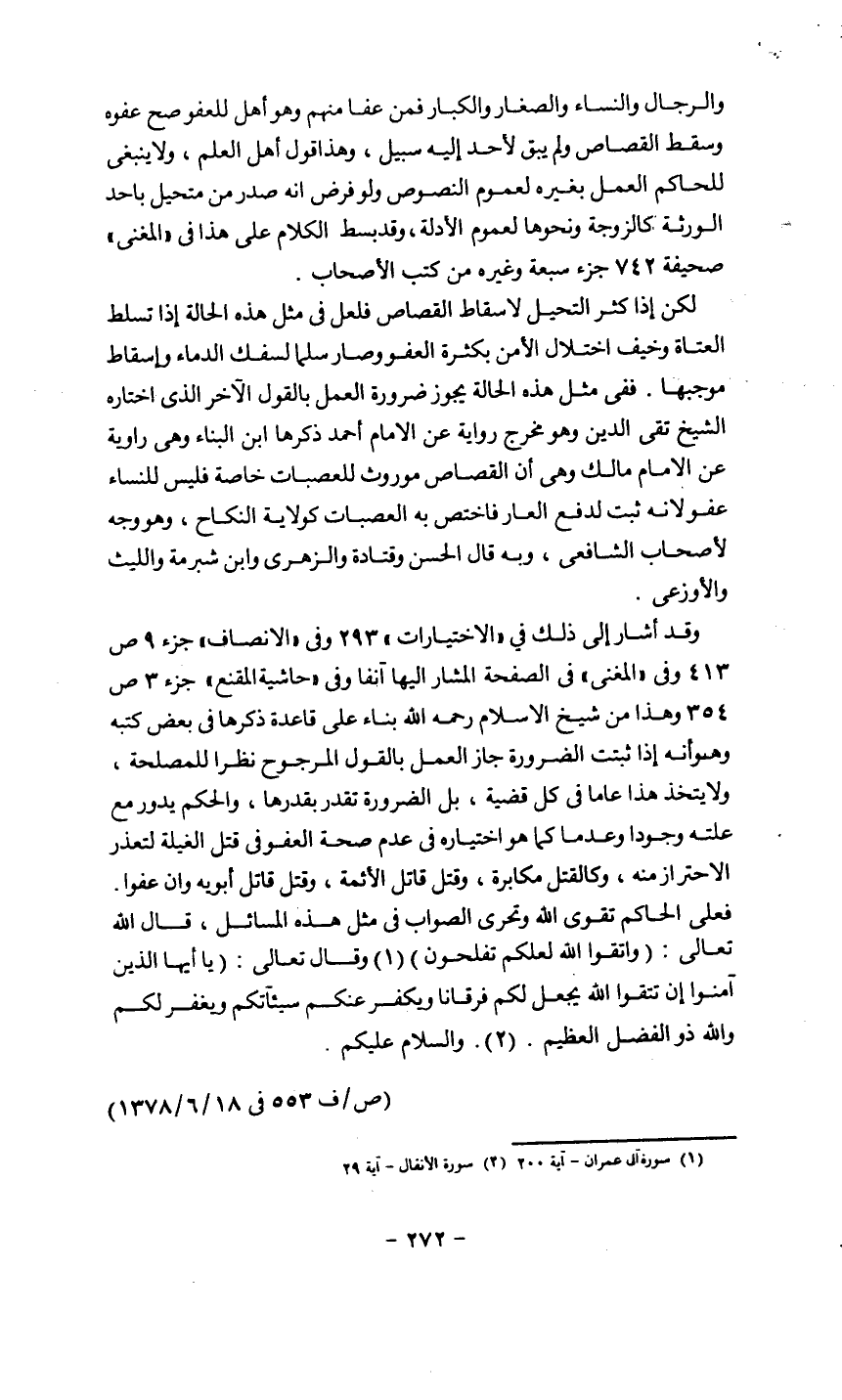 وقد أشار إلى ذلك في "الاختيارات" 293 وفي "الإنصاف" جزء 9 ص413 وفي "المعنى" في الصفحة المشار إليها آنفاً وفي "حاشية المقنع" جزء 4 ص354 وهذا من شيخ الإسلام رحمه الله بناء على قاعدة ذكرها في بضع كتبه وهو أنه إذا ثبتت الضرورة جاز العمل بالقول المرجوح نظراً للمصلحة، ولا يتخذ هذا عاماً في كل قضية، بل الضرورة تقدر بقدرها، والحكم يدور مع علته وجوداً وعدماً كما هو اختياره في عدم صحة العفو في قتل الغيلة لتعذر الاحتراز منه، وكالقتل مكابرة، وقتل قاتل الأئمة، وقتل قاتل أبويه وإن عفوا، فعلى الحاكم تقوى الله وتحري الصواب في مثل هذه المسائل، قال الله تعالى: {واتقوا الله لعلكم تفلحون} (¬1) . وقال تعالى: {يا أيها الذين آمنوا إن تتقوا الله يجعل لكم فرقاناً ويكفر عنكم سيئاتكم ويعفر لكم والله ذو الفضل العظيم} (¬2) . والسلام عليكم.