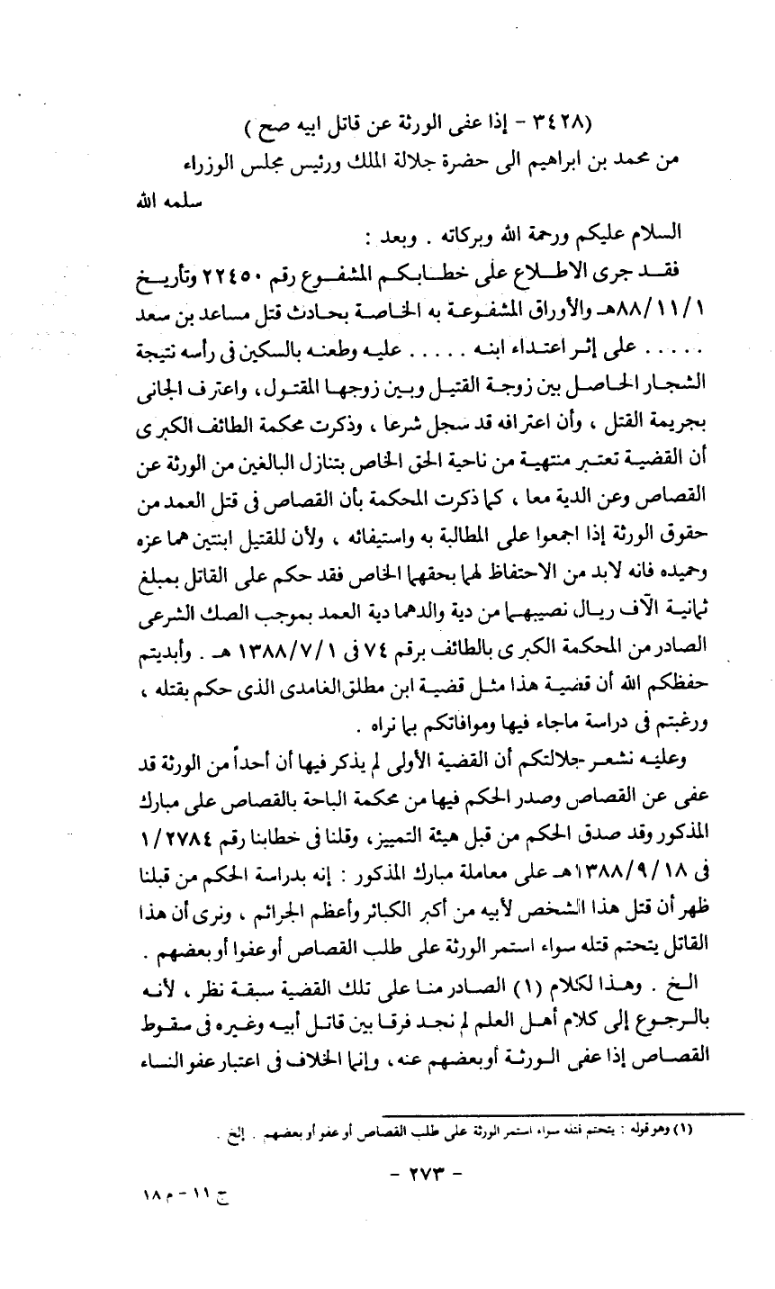 فقد جرى الاطلاع على خطابكم المشفوع رقم 22450 وتاريخ 1/11/88هـ والأوراق المشفوعة به الخاصة بحادث قتل مساعد بن سعد...... على إثر اعتداء ابنه...... عليه وطعنه بالسكين في رأسه نتيجة الشجار الحاصل بين زوجة القتيل وبين زوجها المقتول، واعترف الجاني بجريمة القتل، وأن اعترافه قد سجل شرعاً، وذكرت محكمة الطائف الكبرى أن القضية تعتبر منتهية من ناحية الحق الخاص بتنازل البالغين من الورثة عن القصاص وعن الدية معاً، كما ذكرت المحكمة بأن القصاص في قتل العمل من حقوق الورثة إذا اجمعوا على المطالبة به واستيفائه، ولأن للقتيل ابنتين هما عزة وحميدة، فإنه لابد من الاحتفاظ لها بحقهما الخاص فقد حكم على القاتل بمبلغ ثمانية آلاف ريال نصيبهما من دية والدهما دية العمد بموجب الصك الشرعي الصادر من المحكمة الكبرى بالطائف برقم 74 في 1/7/1388هـ، وأبديتم حفظكم الله أن قضية مثل قضية ابن مطلق الغامدي الذي حكم بقتله ورغبتم في دراسة ما جاء فيها وموافاتكم بما نراه.