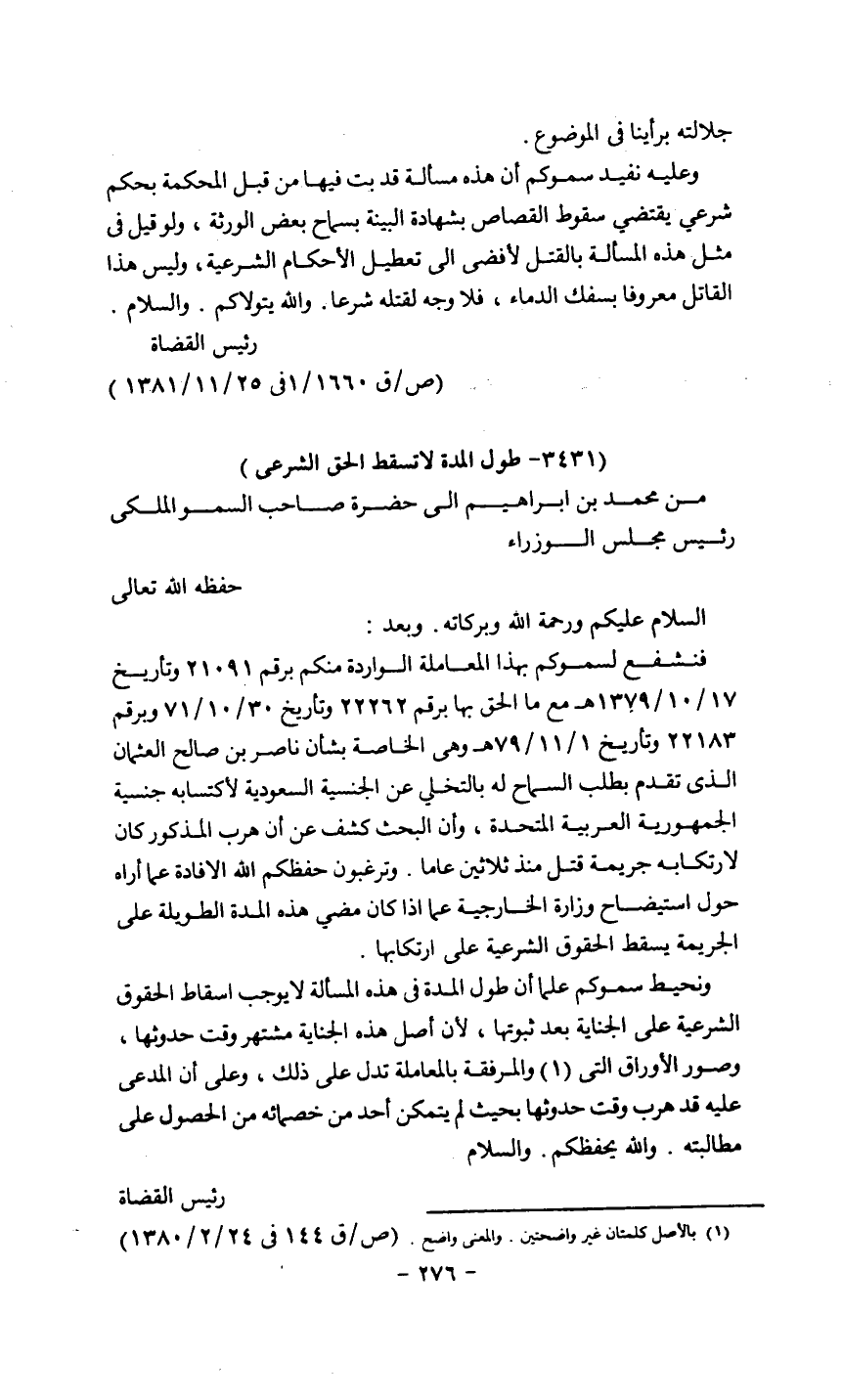فنشفع لسموكم بهذه المعاملة الواردة منكم برقم 21091 وتاريخ 17/10/1379 مع ما ألحق بها برقم 22262 وتاريخ 30/10/1381 وبرقم 22183 وتاريخ 1/11/1379 وهي خاصة بشأن ناصر بن صالح العثمان الذي تقدم بطلب السماح له بالتخلي عن الجنسية السعودية لاكتسابه جنسية الجمهورية العربية المتحدة، وأن البحث كشف عن أن هرب المذكور كان لارتكابه جريمة قتل منذ ثلاثين عاماً، وترغبون حفظكم الله الإفادة عما أراه حول استيضاح وزارة الخارجية عما إذا كان مضي هذه المدة الطويلة على الجريمة يسقط الحقوق الشرعية على ارتكابها.