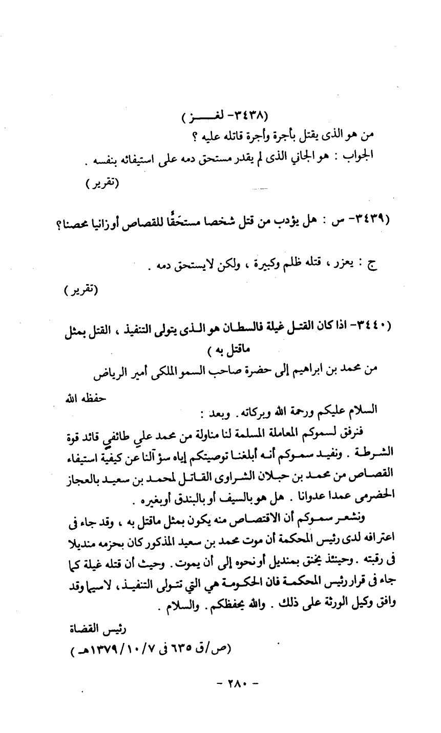 ونشعر سموكم أن الاقتصاص منه يكون بمثل ما قتل به، وقد جاء في اعترافه لدى رئيس المحكمة أن موت محمد بن سعيد المذكور كان بحزمة منديلا في رقبته، وحينئذ يخنق بمنديل أو نحوه إلى أن يموت، وحيث أن قتله غيلة كما جاء في قرار رئيس المحكمة فإن الحكومة هي التي تتولى التنفيذ، لا سيما وقد وافق وكيل الورثة على ذلك. والله يحفظكم، والسلام.