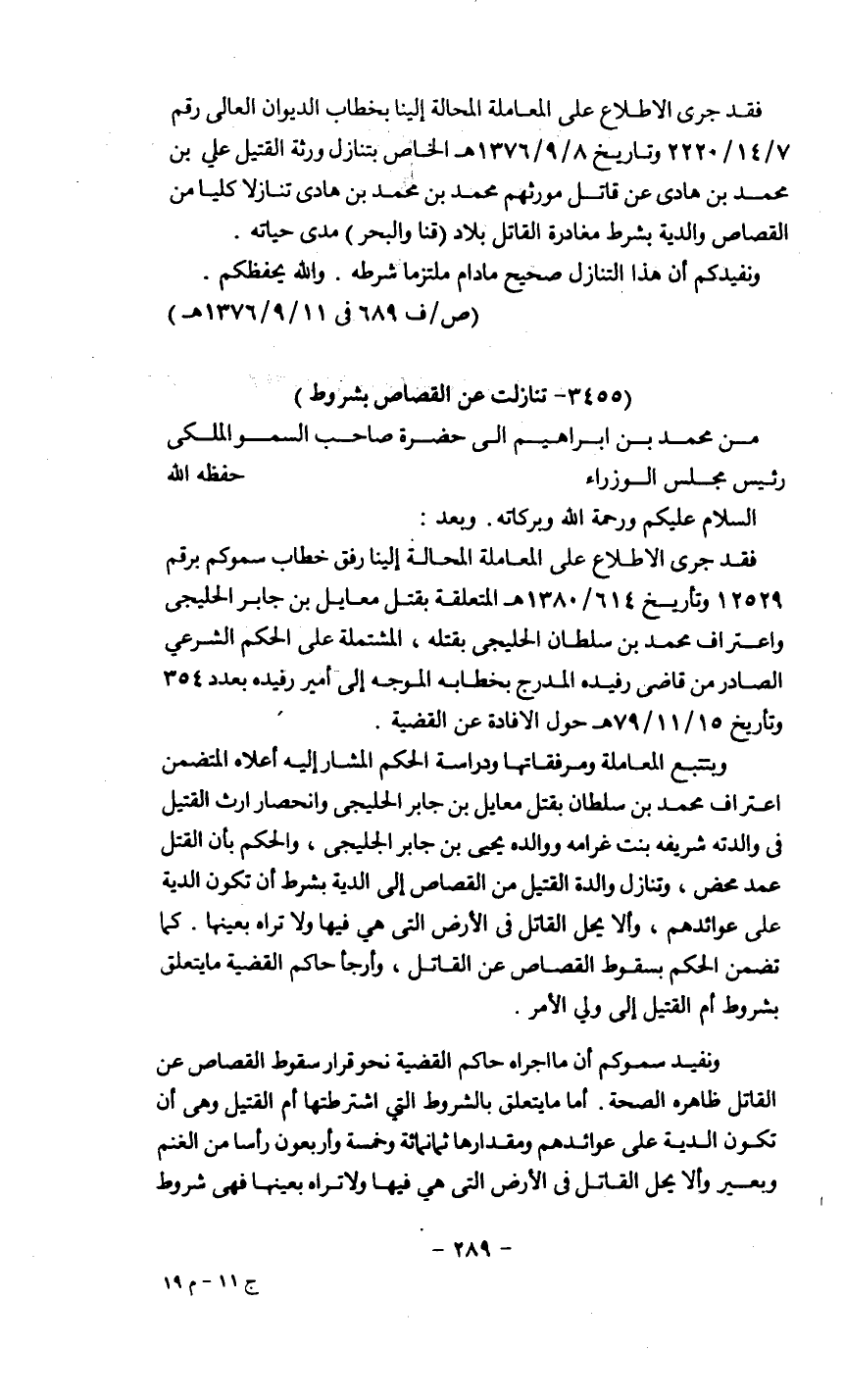 ونفيد سموكم أن ما أجراه حاكم القضية نحو قرار سقوط القصاص عن القاتل ظاهره الصحة، أما ما يتعلق بالشروط التي اشترطتها أم القتيل وهي أن تكون الدية على عوائدهم ومقدارها ثمانمائة وخمسة وأربعون رأساً من الغنم وبعير وألا يحل القاتل في الأرض التي هي فيها ولا تراه بعينها فهي شروط