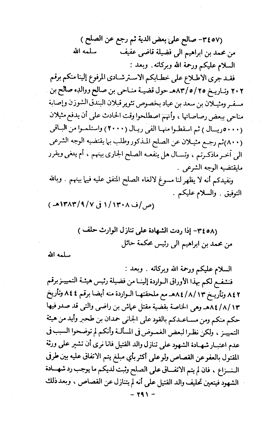فنشفع لكم بهذه الأوراق الواردة إلينا من فضيلة رئيس هيئة التمييز برقم 842 وتاريخ 13/8/84اهـ مع ملحقاتها الواردة منه أيضاً برقم 844 وتاريخ 13/8/84هـ وهي الخاصة بقضية مقتل عماش بن راضي والتي قد صدر فيها حكم منكم ومن مساعدكم بالقود على الجاني حمدان بن طحبر وأيد من هيئة التمييز، ولكن نظراً لبعض الغموض في المسألة وأنكم لم توضحوا السبب في عدم اعتبار شهادة الشهود على تنازل والد القتيل فإنا نرى أن نشير على ورثة المقتول بالعفو عن القصاص ولو على أكثر بأي مبلغ يتم الاتفاق عليه بين طرفي النزاع، فإن لم يتم الاتفاق على الصلح وثبت لديكم ما يوجب رد شهادة الشهود فيتعين تحليف والد القتيل على أنه لم يتنازل عن القصاص، وبعد ذلك