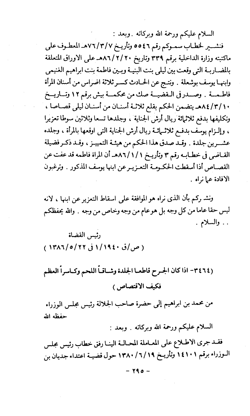 فنشير لخطاب سموكم رقم 5546 وتاريخ 7/3/1386 المعطوف على ما كتبته وزارة الداخلية برقم 339 وتاريخ 20/2/1386 على الأوراق المتعلقة بالمضاربة التي وقعت بين ليلى بنت البنية وبني فاطمة بنت إبراهيم الغنيمي وابنها يوسف بوشعلة. ونتج عن الحادث كسر ثلاثة أضراس من أسنان المرأة فاطمة، وصدر في القضية صك من محكمة بيش برقم 12 وتاريخ 10/3/1384 يتضمن الحكم بقلع ثلاثة أسنان من أسنان ليلى قصاصاً، وتكليفها بدفع ثلاثمائة ريال أرش الجناية، وجلدها تسعاً وثلاثين سوطاً تعزيراً، وإلزام يوسف بدفع ثلاثمائة ريال أرش الجناية التي أوقعها بالمرأة، وجلده عشرين جلدة، وقد صدق هذا الحكم من هيئة التمييز، وقد ذكر فضيلة القاضي في خطابه رقم 3 وتاريخ 1/1/1386 أن المرأة فاطمة قد عفت عن القصاص إذا أسقطت الحكومة التعزير عن ابنها يوسف المذكور، وترغبون الإفادة عما نراه.