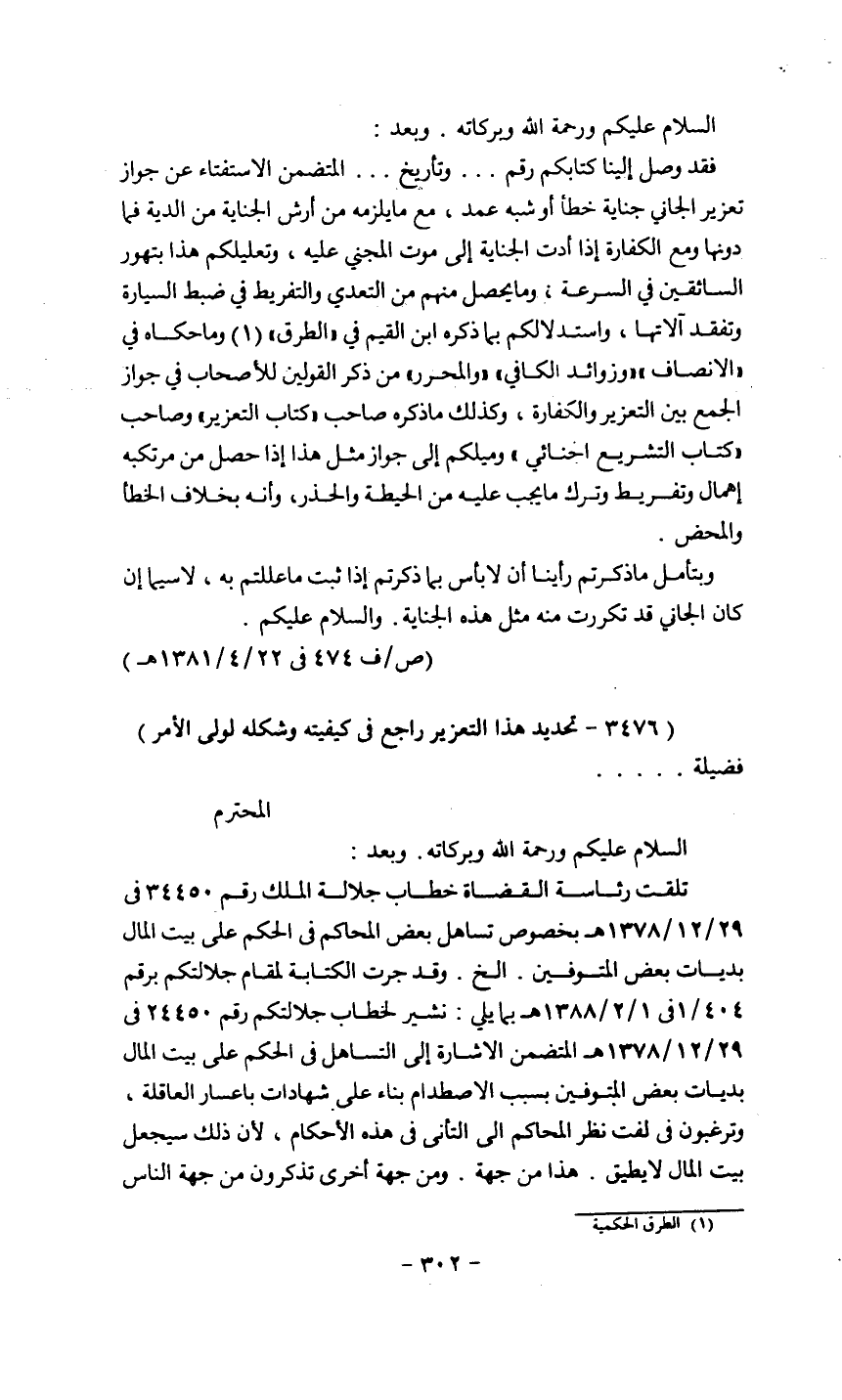 فقد وصل إلينا كتابكم رقم...... وتاريخ....... المتضمن الاستفتاء عن جواز تعزير الجاني جناية خطأ أو شبه عمد، مع ما يلزمه من أرض الجناية من الدية فما دونها ومع الكفارة إذا أدت الجناية إلى موت المجني عليه، وتعليلكم هذا بتهور السائقين في السرعة، وما يحصل منهم من التعدي والتفريط في ضبط السيارة وتفقد آلاتها، واستدلالكم بما ذكره ابن القيم في "الطرق" (¬1) وما حكاه في "الإنصاف" "وزوائد الكافي" "والمحرر" من ذكر القولين للأصحاب في جواز الجمع بين التعزير والكفارة، وكذلك ما ذكره صاحب "كتاب التعزير" وصاحب "كتاب التشريع الجنائي" وميلكم إلى جواز مثل هذا إذا حصل من مرتكبه إهمال وتفريط وترك ما يجب عليه من الحيطة والحذر، وأنه بخلاف الخطأ والمحض.