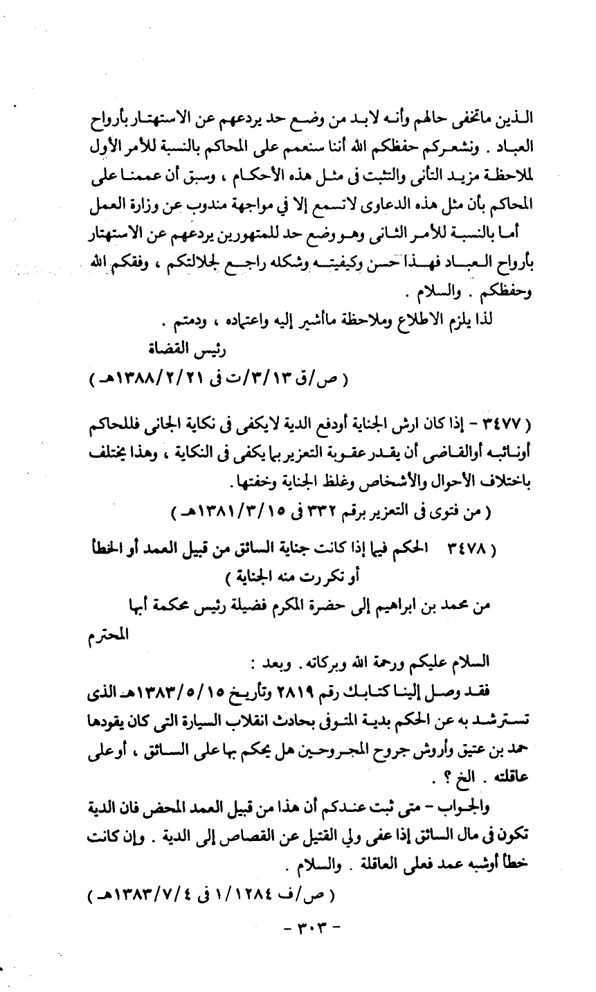 فقد وصل إلينا كتابك رقم 2819 وتاريخ 15/5/1383هـ الذي تسترشد به عن الحكم بدية المتوفى بحادث انقلاب السيارة التي كان يقودها حمد بن عتيق وأروش جروح المجروحين هل يحكم بها على السائق أو على عاقلته.. الخ؟