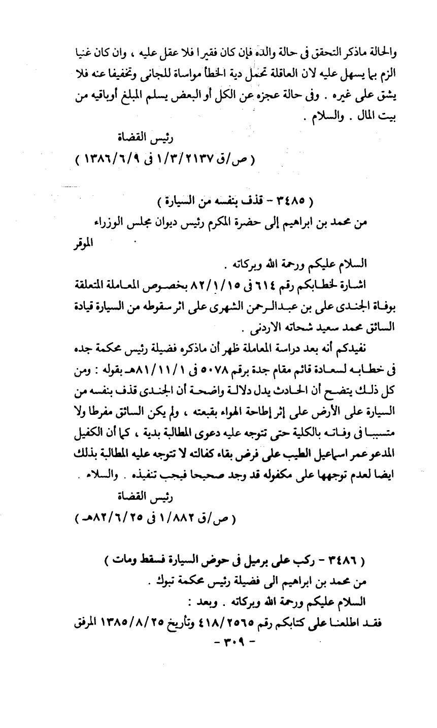 إشارة لخطابكم رقم 614 في 15/1/1382 بخصوص المعاملة المتعلقة بوفاة الجندي علي بن عبد الرحمن الشهري على إثر سقوطه من السيارة قيادة السائق محمد سعيد شحاته الأردني.