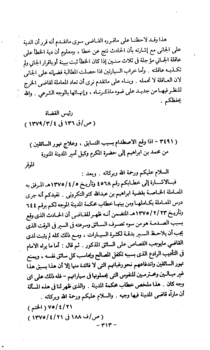 نفيدكم أنه جرى درس المعاملة بكاملها ومن بينها خطاب محكمة المدينة المنورة الموجة لكم برقم 644 وتاريخ 23/2/1375 المتضمن أنه ظهر للقاضي أن الحادث الذي وقع بسبب الصدمة هو من سوء تصر ف السائق وسرعته في السير في الوقت الذي يجب أن يلاحظ السير بدقة لكثرة السيارات، ومع ذلك كله لم يثبت لدى القاضي ما يوجب القصاص على السائق المذكور، ثم قال: أما ما يراه الإمام في التأديب الرادع الذي بسببه تكفل المصالح ويحاسب كل سائق نفسه، ويمنع تهور السائقين واندفاعهم نحو رغباتهم التي لا فائدة منها إلا أن هذا يسبق هذا غير مبالين ومحترمين للنفوس التي يحملونها في سياراتهم، فله ذلك على أي وجه كان هذا ملخص خطاب محكمة المدينة، والذي ظهر لنا في هذه المسألة أن ما رآه قاضي المدينة فيها وجيه، والسلام عليكم ورحمة الله وبركاته.