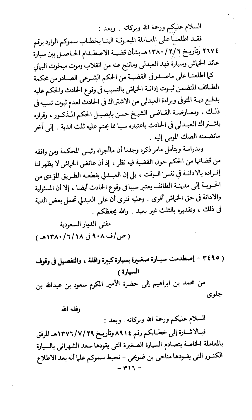 فقد اطلعنا على المعاملة المبعوثة إلينا بخطاب سموكم الوارد برقم 2674 وتاريخ 6/2/1380 بشأن قضية الاصطدام الحاصل بين سيارة عائد الخماش وسيارة فهد العبدلي وما نتج عنه من انقلاب وموت مبخوت اليماني، كما اطلعنا على ما صدر في القضية من الحكم الشرعي الصادر من محكمة الطائف المتضمن ثبوت إدانة الخماش بالتسبب في وقوع الحادث والحكم عليه بدفع دية المتوفى وبراءة العبدلي من الاشتراك في الحادث لعدم ثبوت تسببه في ذلك، ومعارضة القاضي الشيخ حسن بابصيل الحكم المذكور، وقراره باشتراك العبدلي في الحادث باعتباره سبباً مما يحتم ثلث الدية، إلى آخر ما تضمنه الصك المومى إليه.