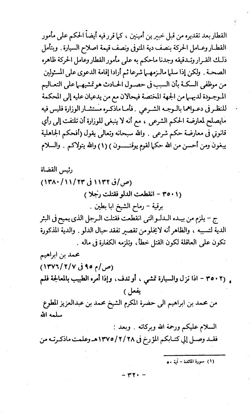 وبتأمل ذلك القرار وتدقيقه وجدنا ما حكم به على مأمور القطار وعامل الحركة ظاهره الصحة، ولكن إذا سلما ما لزمهما شرعاً ثم أرادا إقامة الدعوى على المسئولين من موظفي السكة بأن السبب في حصول الحادث هو تمشيهما على التعاليم الموجودة لديهما من الجهة المختصة فيحالان مع من يدعيان عليه إلى المحكمة للنظر في دعواهما بالوجه الشرعي. فأما ما ذكره مستشار الوازرة فليس فيه ما يصلح لمعارضة الحكم الشرعي، مع أنه لا ينبغي للوزارة أن تلتفت إلى رأي قانوني في معارضة حكم شرعي. والله سبحانه وتعالى يقول: {أفحكم الجاهلية يبغون ومن أحسن من الله حكماً لقوم يوقنون} (¬1) . والله يتولاكم. والسلام.