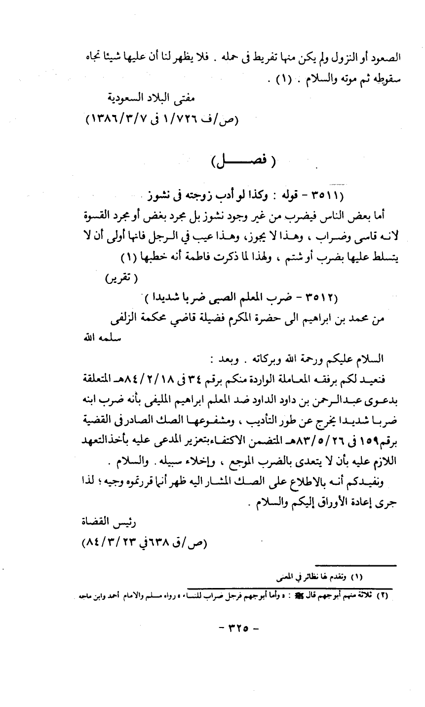 فنعيد لكم برفقه المعاملة الواردة منكم برقم 34 في 18/2/1384 المتعلقة بدعوى عبد الرحمن بن داود الداود ضد المعلم إبراهيم المليفي بأنه ضرب ابنه ضرباً شديداً يخرج عن طور التأديب، ومشفوعها الصك الصادر في القضية برقم 159 في 26/5/1383 المتضمن الاكتفاء بتعزير المدعى عليه بأخذ التعهد اللازم عليه بأن لا يتعدى بالضرب الموجع، وإخلاء سبيله وسلام.