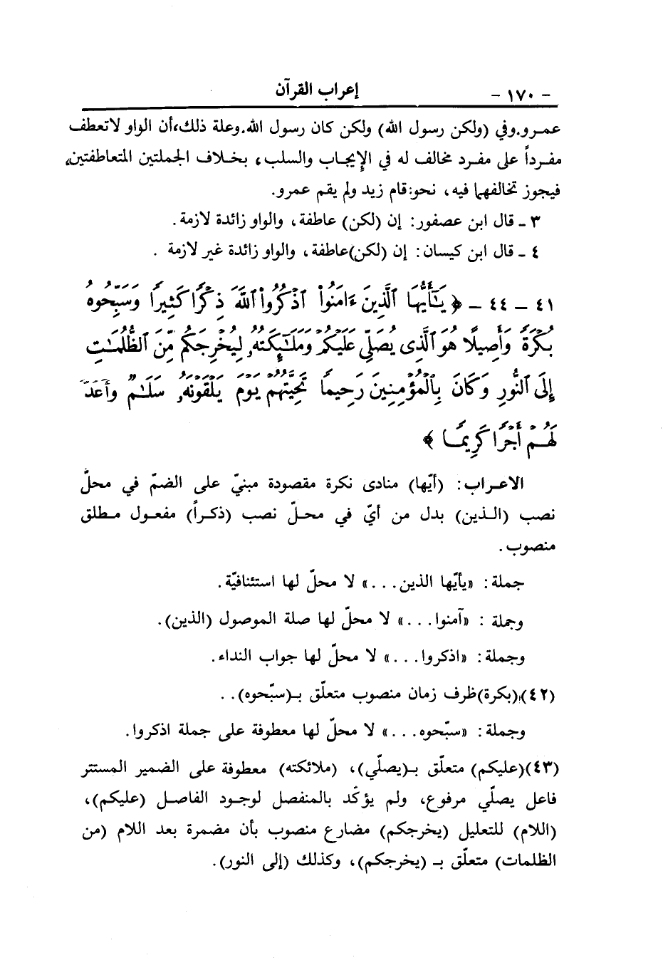 (ثمّ) حرف عطف (بعثنا) مثل نجّينا (من بعد) جارّ ومجرور متعلّق ب (بعثنا) ، و (الهاء) مضاف إليه (رسلا) مفعول به منصوب (إلى قومهم) جارّ ومجرور متعلّق ب (بعثنا) .. و (هم) ضمير مضاف إليه (الفاء) عاطفة (جاؤوا) مثل كذّبوا و (هم) ضمير مفعول به (بالبيّنات) جارّ ومجرور متعلّق ب (جاءوهم) «1» ، (الفاء) عاطفة (ما) نافية (كانوا) فعل ماض ناقص- ناسخ ... والواو اسم كان (اللام) لام الجحود- أو الإنكار- (يؤمنوا) مضارع منصوب بأن مضمرة بعد لام الجحود، وعلامة النصب حذف النون.. والواو فاعل (الباء) حرف جرّ (ما) اسم موصول مبنيّ في محلّ جرّ متعلّق ب (يؤمنوا) ، (كذّبوا) مثل الأول (الباء) حرف جر و (الهاء) ضمير في محلّ جرّ متعلّق ب (كذّبوا) ، (من) حرف جرّ (قبل) اسم مبنيّ على الضمّ في محلّ جرّ متعلّق ب (كذّبوا) «2» .