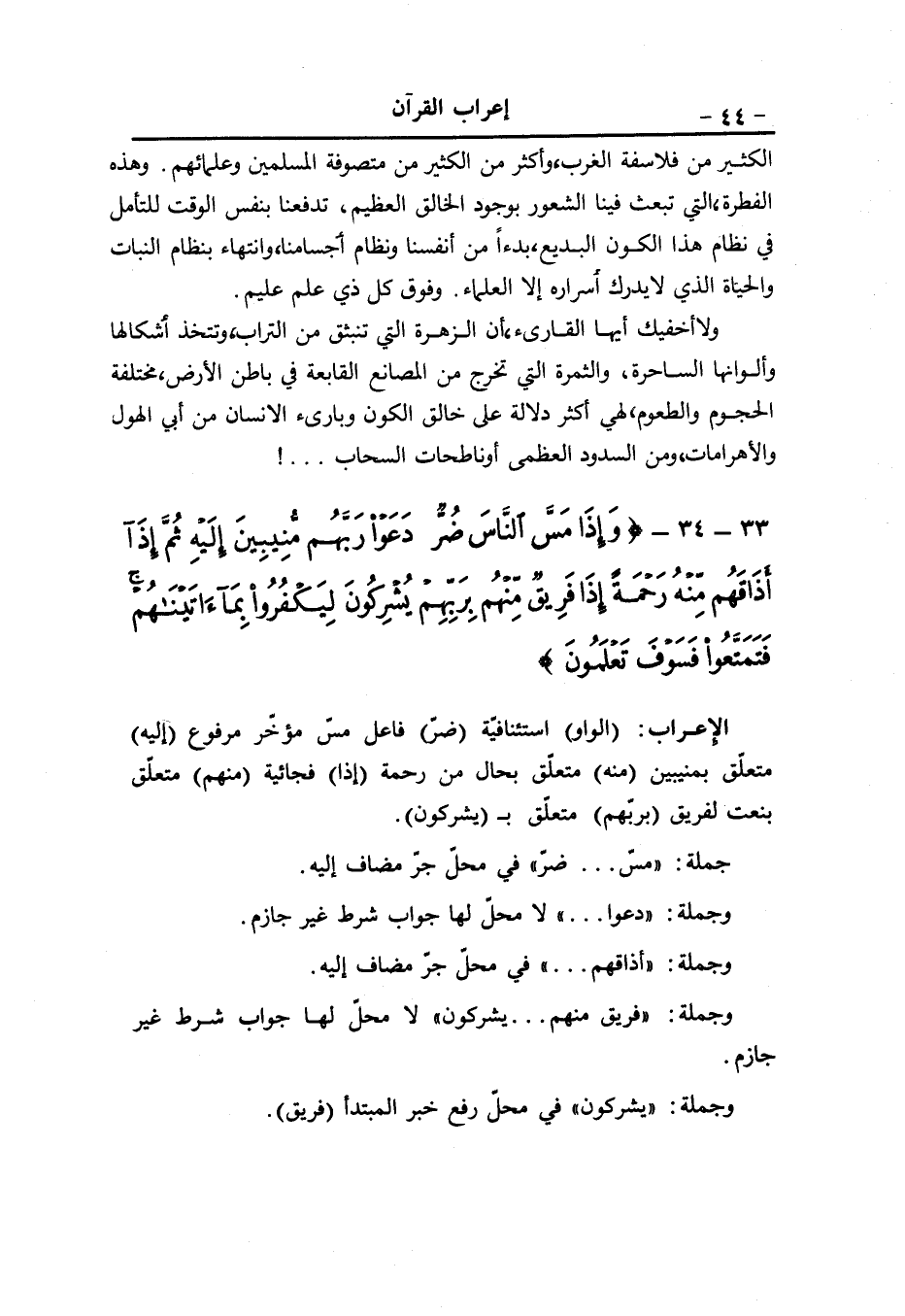 واسمه (أولي) خبر كانوا منصوب وعلامة النصب الياء ملحق بجمع المذكّر (قربى) مضاف إليه مجرور وعلامة الجرّ الكسرة المقدّرة على الألف (من بعد) جارّ ومجرور متعلّق بالاستغفار المنفيّ (ما) حرف مصدريّ «1» (تبيّن) فعل ماض (اللام) حرف جرّ و (هم) ضمير في محلّ جرّ متعلّق ب (تبيّن) ، (أنّ) حرف مشبّه بالفعل و (هم) ضمير في محلّ نصب اسم أنّ (أصحاب) خبر مرفوع (الجحيم) مضاف إليه مجرور.